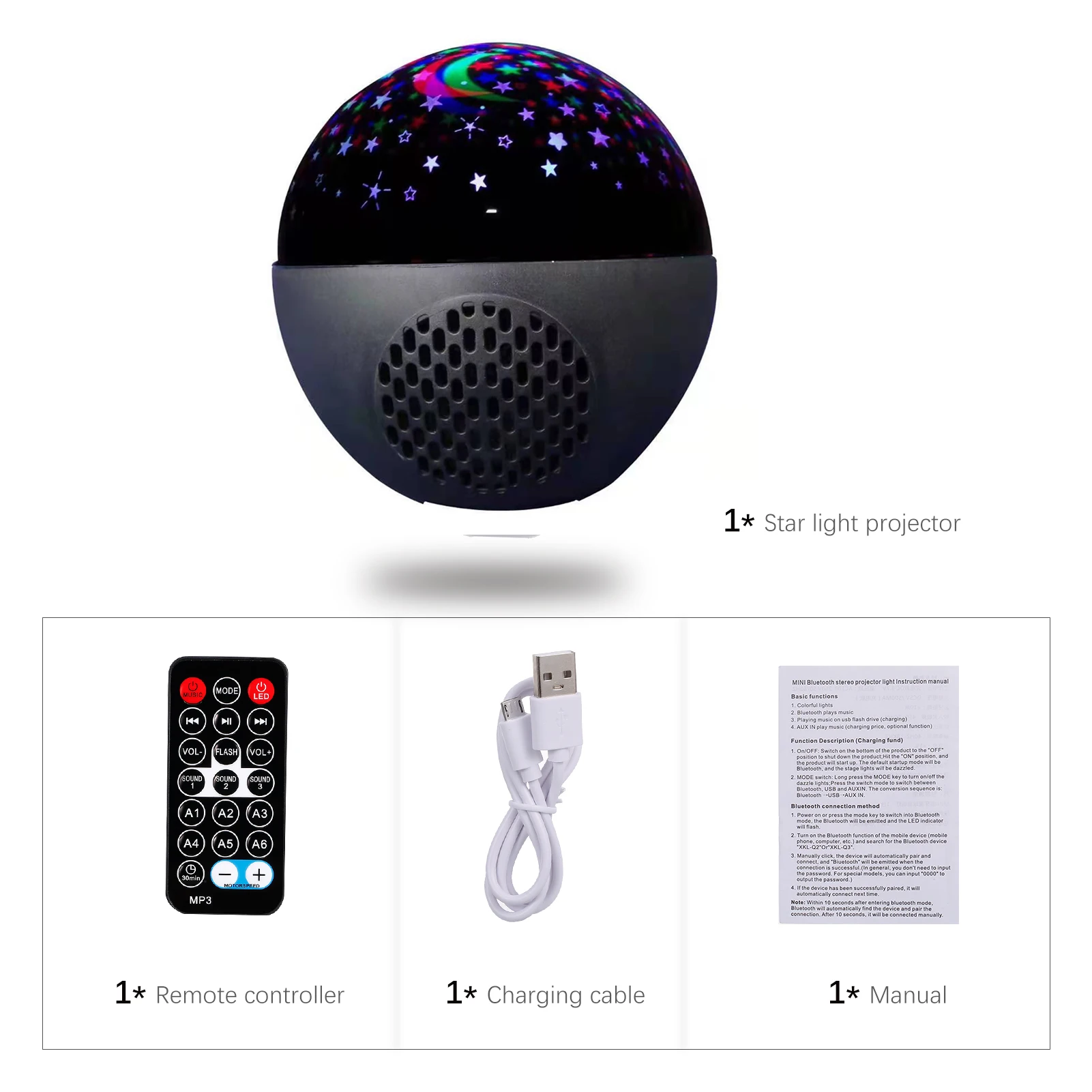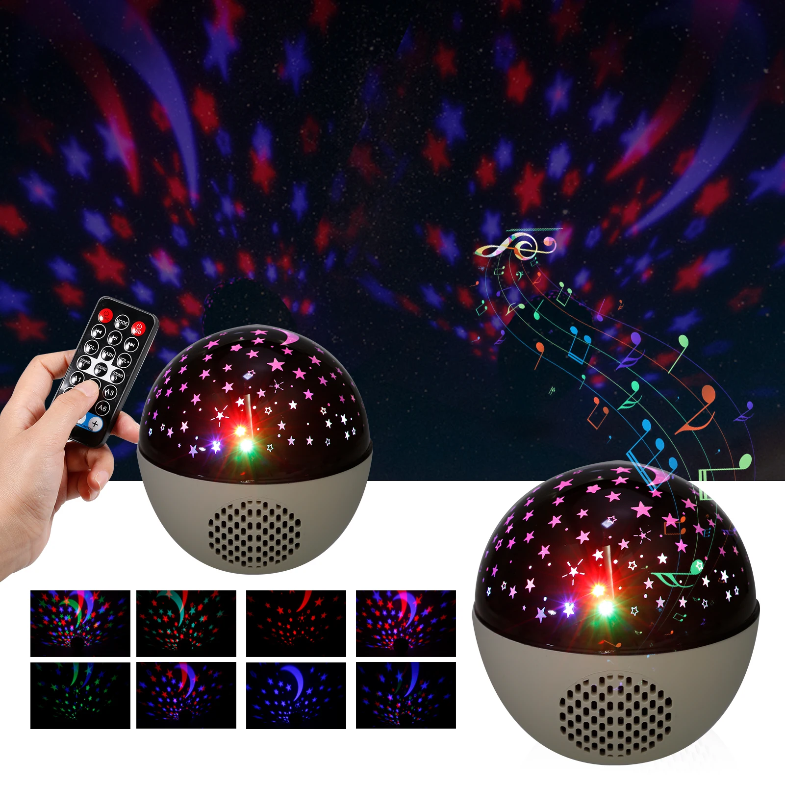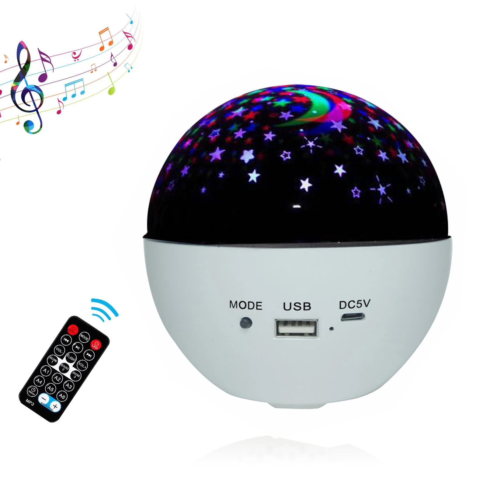 Звездный ночной Светильник-проектор с музыкальным динамиком-2 в 1, это может быть Звездный ночной Светильник-проектор, дающий вам ощущение звездного неба, в то же время, это также может быть музыкальный проигрыватель для прослушивания песен, которые вы хотите. Интерфейс USB (Подключите флэш-диск USB, устройство для чтения карт).