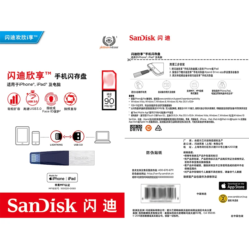 1. Поддерживает iPhone 5 /5C/6/6plus/7/plus/8/8plus/X/XR/xs/и более новые, iPad Air, iPad с дисплеем Retina (4-го поколения), iPad mini с дисплеем Retina, iPad mini и новее, требуется приложение iXpand Drive и iOS 8,2. 2. Доступно для загрузки из App Store. Требуется iOS 8,2. Настройка автоматического резервного копирования в настройках приложения. 3. Поддержка. WMV, . AVI, . МкВ,. MP4, . Форматы видео MOV. Содержание, защищенное DRM, не может быть интегрировано. Проверьте у поставщика содержимого ограничения на воспроизведение. 4. Защита паролем использует 128-bit AES и поддерживается iOS 8,2, Mac OS X v10.6 +, Windows Vista®, Windows®7, Windows 8 и Windows 10. Для Китая: Защита паролем поддерживается iOS 8, Mac OS X v10.6 +, Windows®XP, Windows Vista®, Windows®7, Windows 8 и Windows 10. 5. 1 ГБ = 1000000000 байт. Фактическое пользовательское хранилище меньше. 6. См. www.sandisk.com/wug