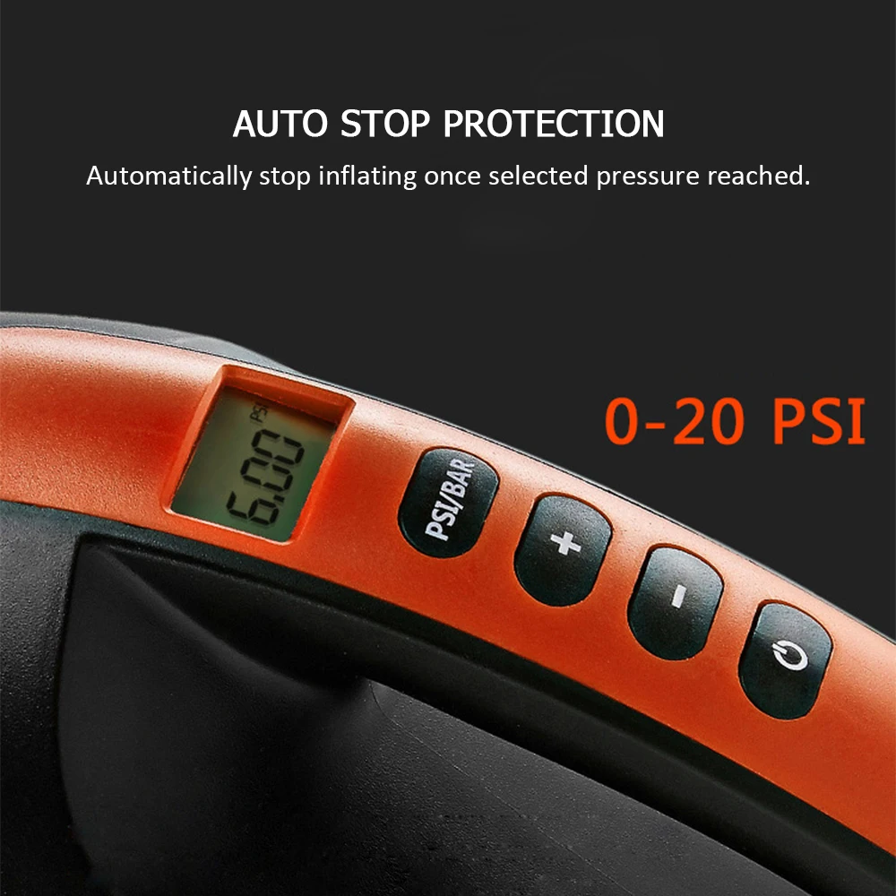Поддерживает рабочий диапазон 0,5-20 фунтов на квадратный дюйм. Он будет автоматически останавливаться, когда PSI достигнет установленного значения. (Примечание: Пожалуйста, не работайте с насосом в течение более 20 минут)