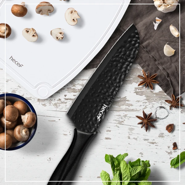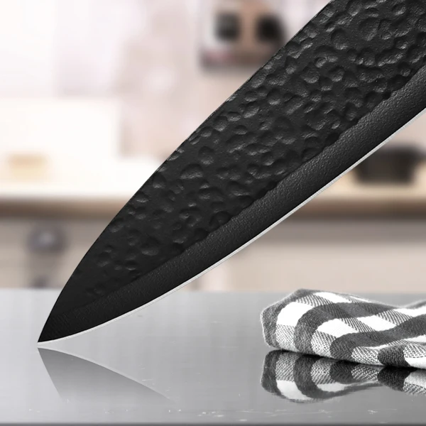 Слой покрытия обеспечивает устойчивый барьер с покрытием между сталью и окружающей средой, который может повысить устойчивость к коррозии и ржавчине, защищая лезвие не царапается твердыми веществами. Более того, весь нож выглядит фантастически и уникально с молотым лезвием, что позволяет избежать попадания пищи на лезвие и легко чистить.
