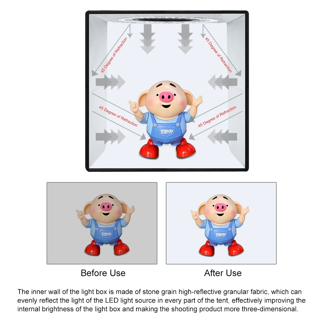 4. Портативный складной дизайн, проще в установке и переноске, Встроенный светодиодный светильник, обеспечивает средний Светильник, предотвращает появление теней и отражения на фотографии.