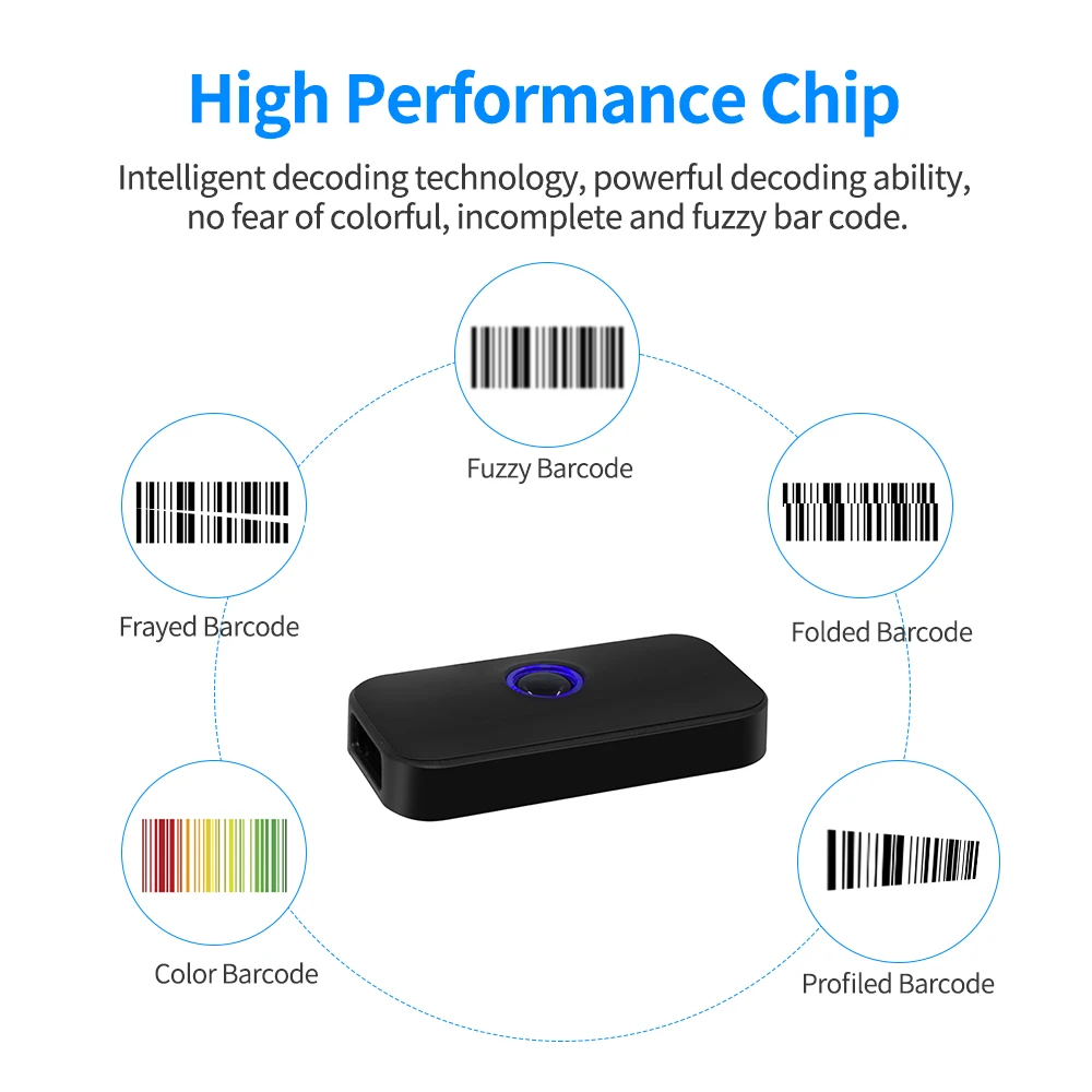 Встроенный чип высокой производительности, мощная Способность декодирования, не бойтесь красочного, неполного и нечеткого штрих-кода. Поддержка бумажного кода и сканирования кода экрана.