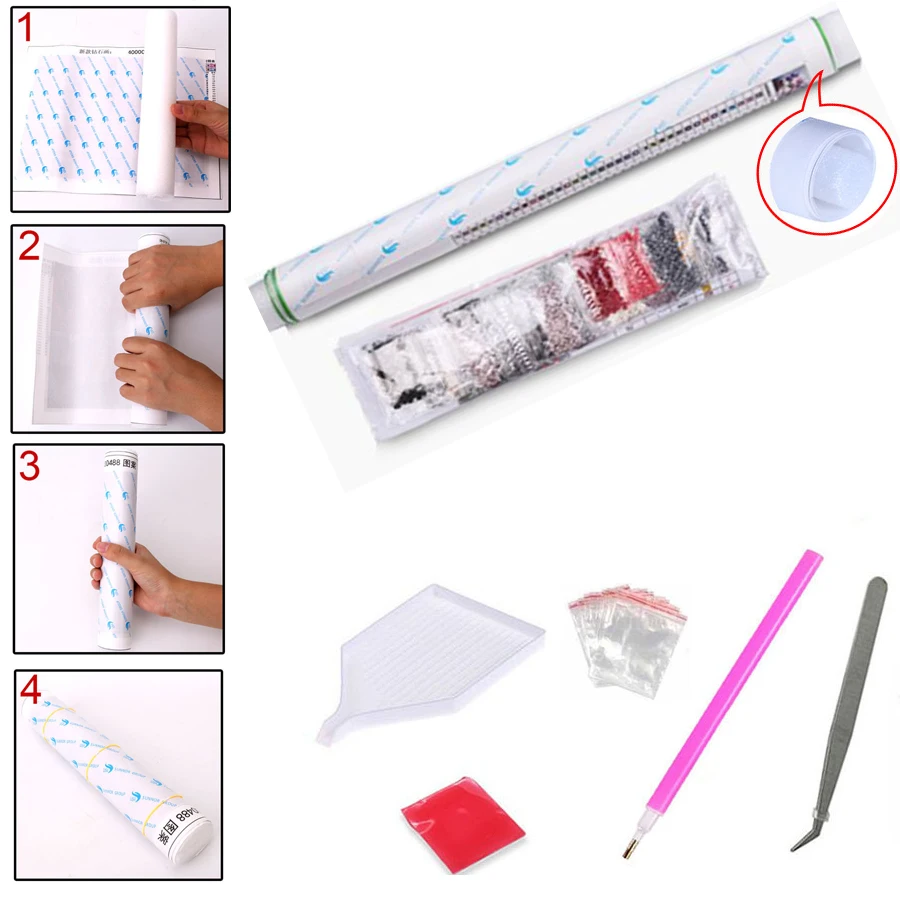 А. Откройте посылку и выньте Все алмазы. B. Приклейте немного клея к верхней части ручки. C. Найдите соответствующие алмазы с помощью контрольного списка, вышитого на стороне холста. D. Приподнимите алмазы с помощью сверла. Е. Поместите алмазы на правильное место, отмеченное на холсте. F. Нажмите на готовую деталь, убедитесь, что она сильно прикреплена. G. Раскатайте законченную картину и лицевой стороной. H. После отделки, вы можете использовать подходящую рамку для рамы и повесить на стену