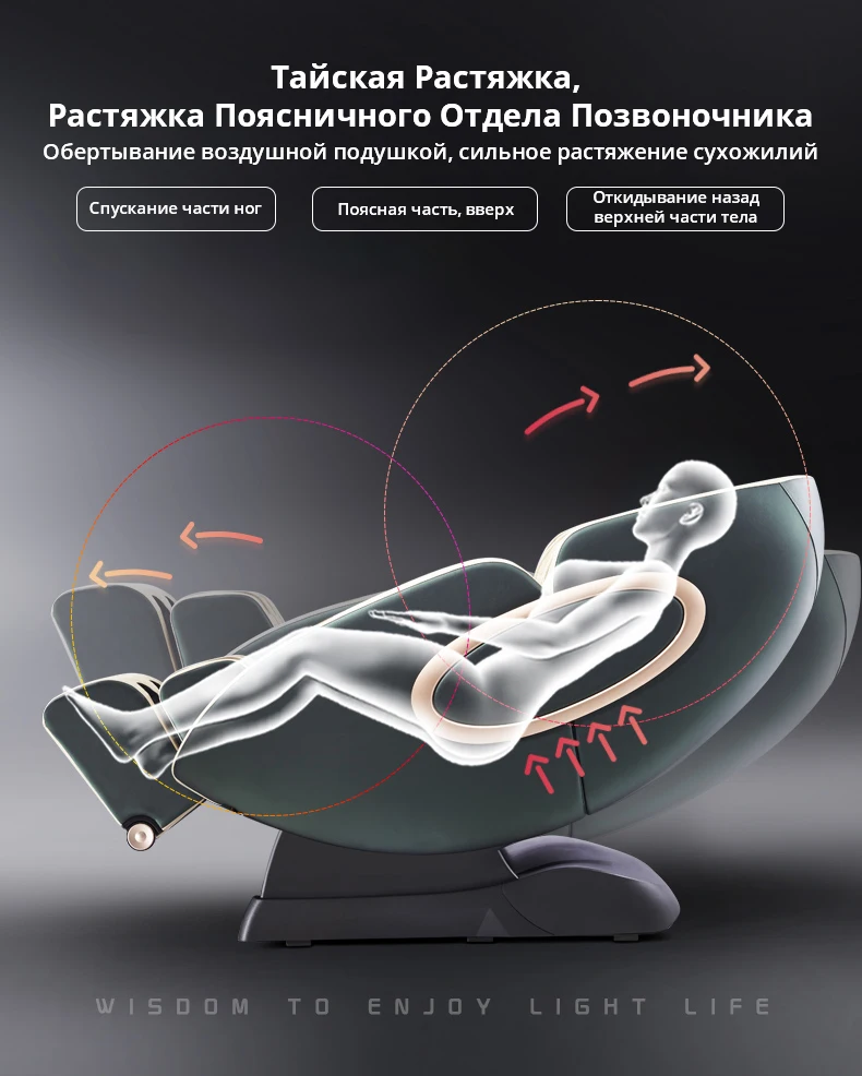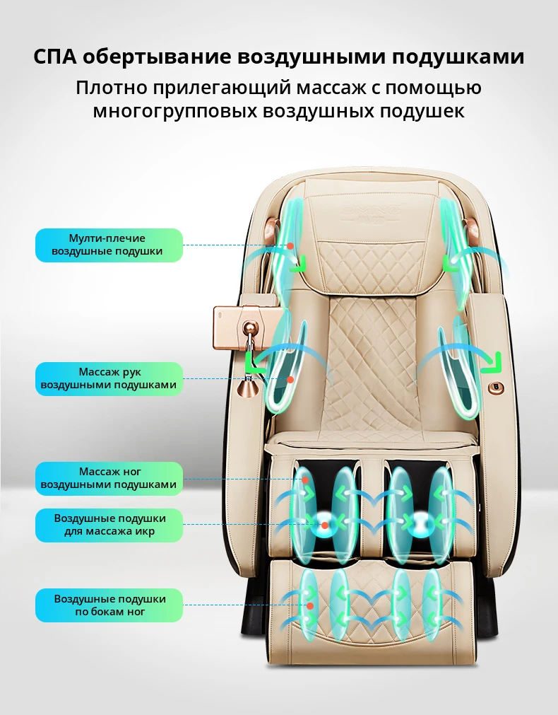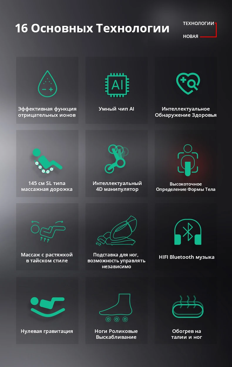 * Анион очистки воздуха * AI смарт-чип * Электроника для здоровья обнаружения * 145 см SL Массажная дорожка * Интеллигентая (ый) 4D манипулятор * Высокоточное Обнаружение формы тела * Эластичный массаж в тайском стиле * Подставка для ног, может управляться независимо * Hi-Fi Bluetooth музыка * Массажное кресло с эффектом "нулевой гравитации • Ножной ролик соскабливания * Нагревание на талии и ногах