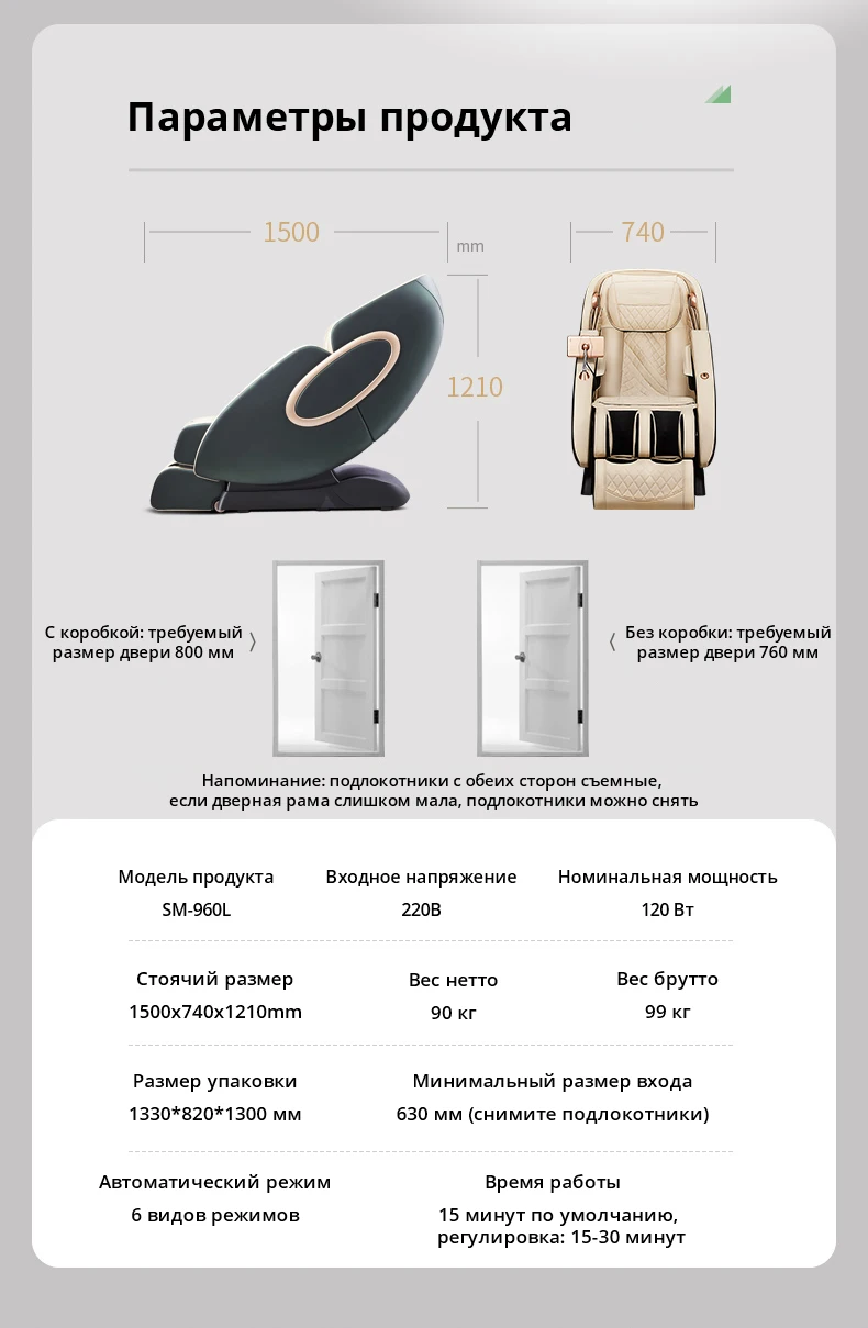 С коробкой: размер двери нужен 800 мм Без коробки: размер двери нужен 760 мм * Модель продукта: SM-960L * Входное напряжение: 220 В * Номинальная мощность: 120 Вт * Постоянный Размер: 1500x740x1210мм * Вес нетто: 90 кг * Вес брутто: 99 кг * Размер упаковки: 1330*820*1300 мм * Минимальный размер входа: 630 мм (снимите подлокотники) * Автоматический режим: 6 видов режимов * Время работы: 15 минут по умолчанию * Регулировка: 15-30 минут