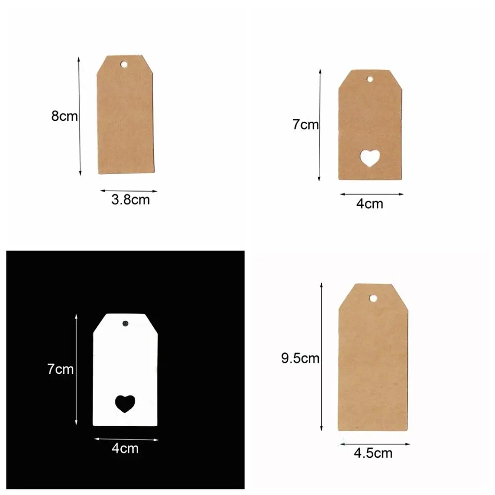 Материал: крафт-бумага 350 г Размер: 3x5 см, 3,8x8 см, 4x7 см, 4,5x9 см, 5x10 см Цвет: коричневый, белый и черный Пустой дизайн, вы можете нарисовать на нем все, что вам нравится. Пожалуйста, обратите внимание, что шнур входит в комплект. 100 шт./лот