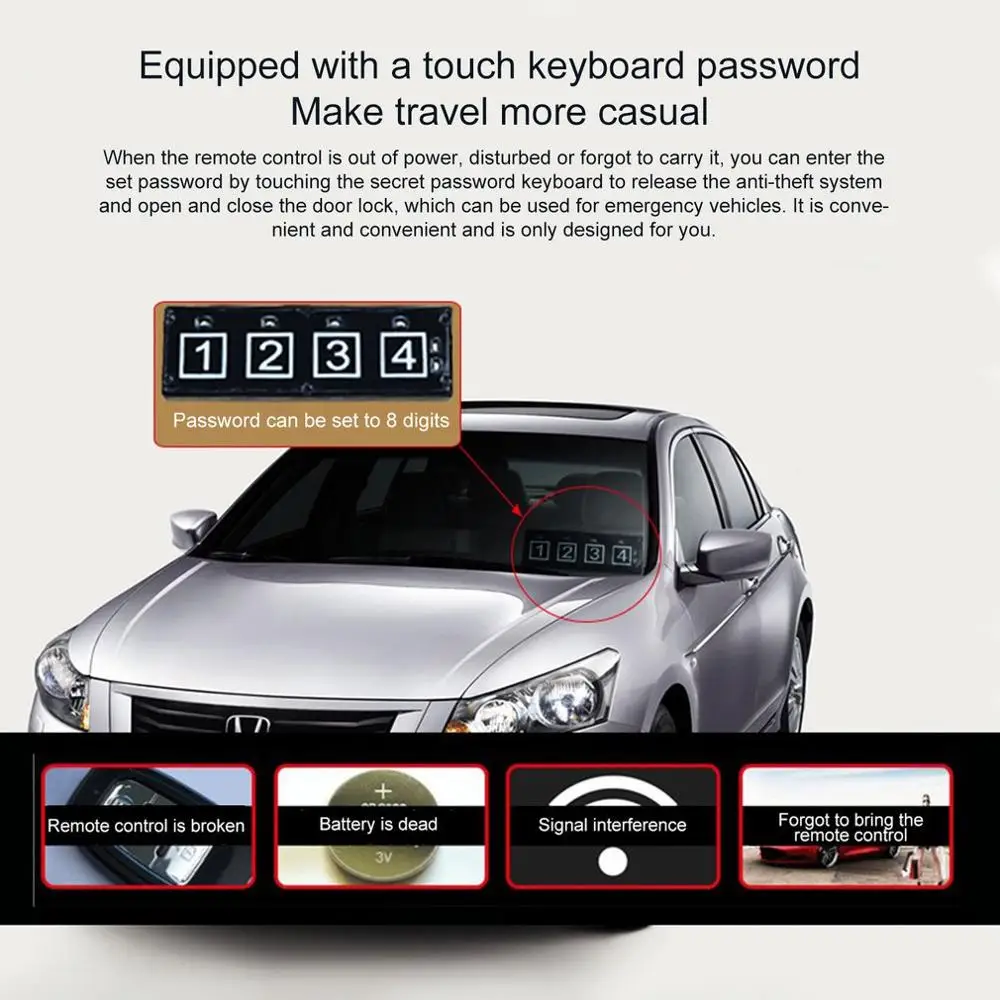 Функция: Запуск одной кнопкой, удаленный запуск удаленно, бесключевая запись, сенсорная клавиатура с паролем для разблокировки, блокировка вождения, противокражная сигнализация