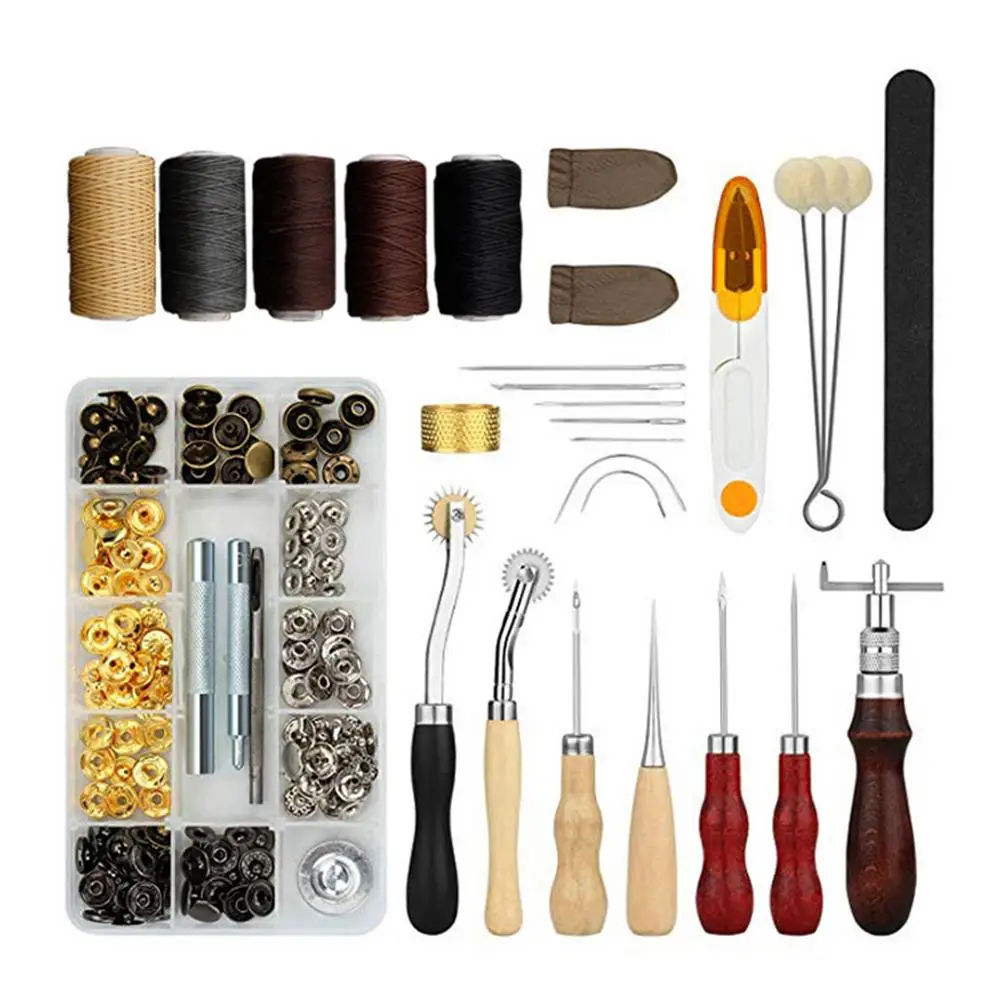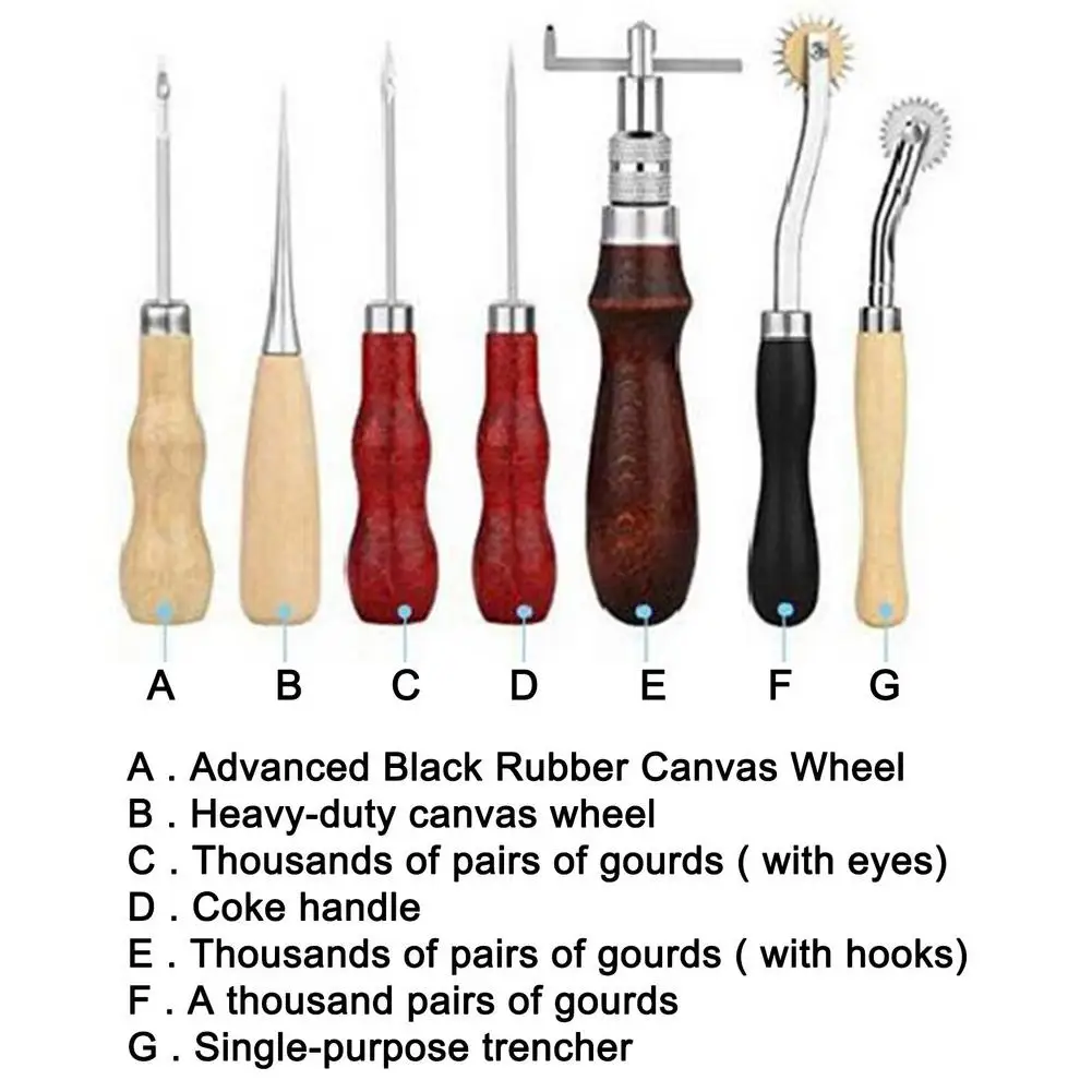 3. Широкий спектр применения: Этот набор кожаных инструментов содержит все основные инструменты для ручного шитья и ручного шитья. Подходит для начинающих или профессионалов. Вы можете сшить различные виды кожи, ткани, джинсовой ткани, холста, брезента или других предметов. Идеальный инструмент для ремонта ковров, обивки, пальто, палаток, матрасов.