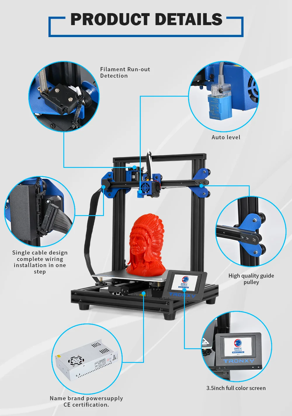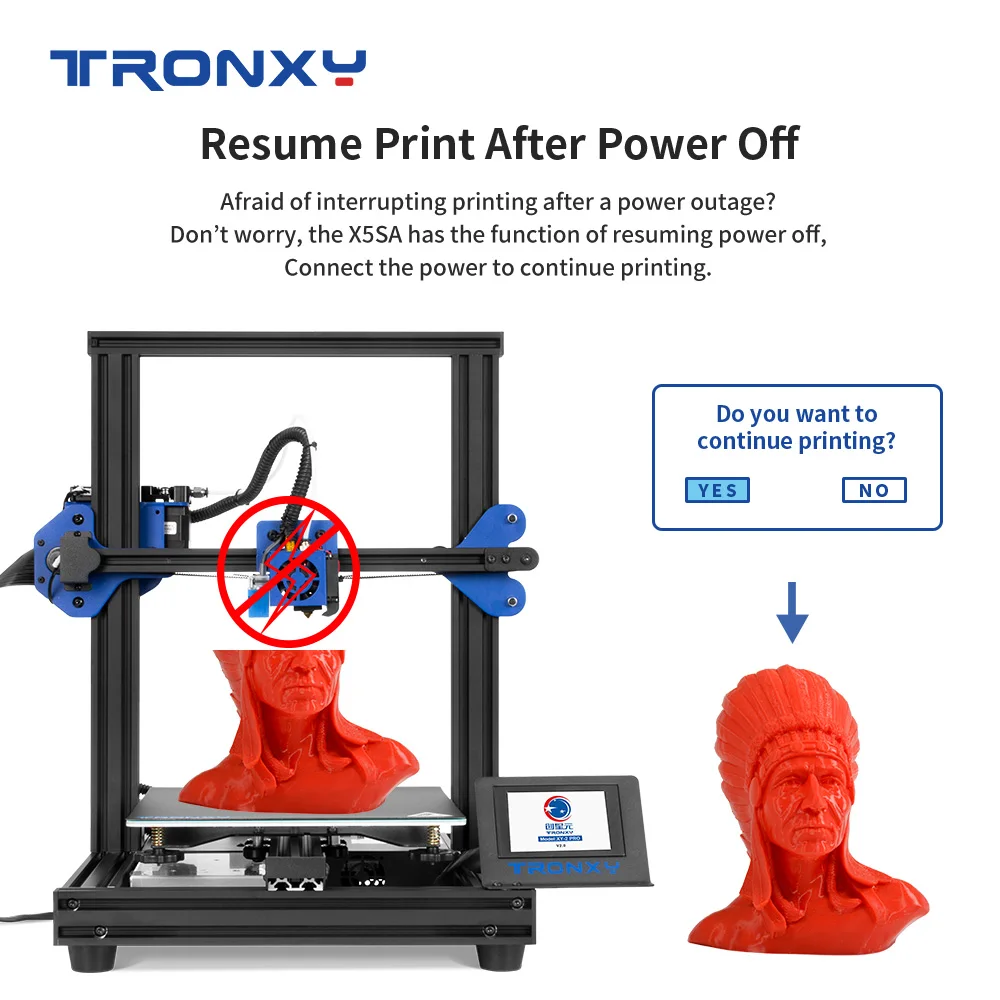 2. Три важных функции ------- 1) Автоматическое выравнивание, помогает избежать многих проблем с выравниванием. 2) возобновите печать после выключения питания. 3) Обнаружение истощения нити, когда нить вымотана или отключена, принтер будет автоматически приостановлен, чтобы обеспечить плавную печать