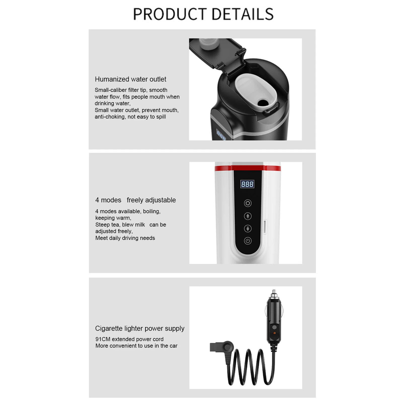 Меры предосторожности:1. 70 Вт-100 Вт двойная мощность 100 Вт (режим высокого тока) и 75 Вт (режим низкого тока) Двухрежимная выходная мощность, решить проблему ограниченного тока, не может использоваться в некоторых моделях прикуривателя. Метод регулировки высокой и низкой мощности: Длительное нажатие кнопки верхней функции, Быстрое нагревание и медленное нагревание на выбор, Быстрое нагревание-это Режим высокой мощности, в это время, вода кипятится быстрее, и медленный режим нагрева медленнее! Обратите внимание, что если режим быстрого нагрева не может быть сгорел, пожалуйста, выберите режим медленного нагрева, что означает, что ваш автомобиль не поддерживает высокую мощность, то есть, ток на выходе не может достигать высокой мощности 8А постоянного тока!