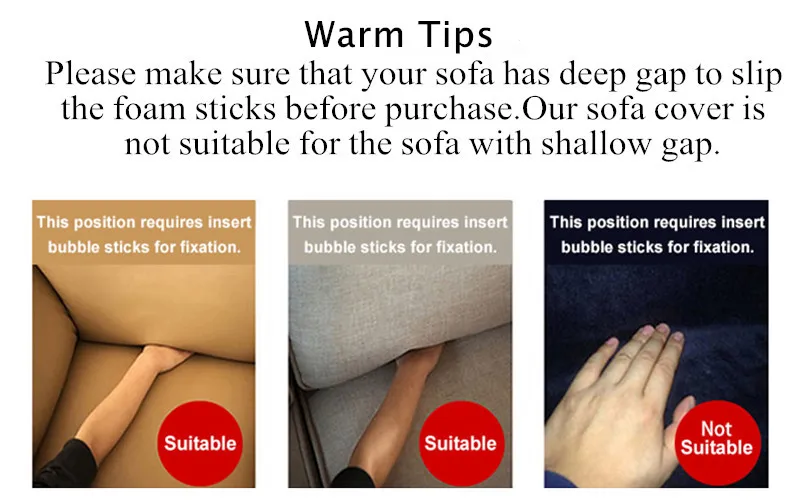 1. Этот чехол для дивана подходит для дивана, который имеет зазор, между сидением со спинкой и подлокотником. (Пожалуйста, убедитесь, что ваш диван имеет глубокий зазор, чтобы выскользнуть пенопластовые стержни перед покупкой. Наш чехол для дивана не подходит для дивана с мелким зазором.)