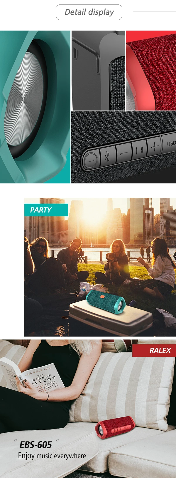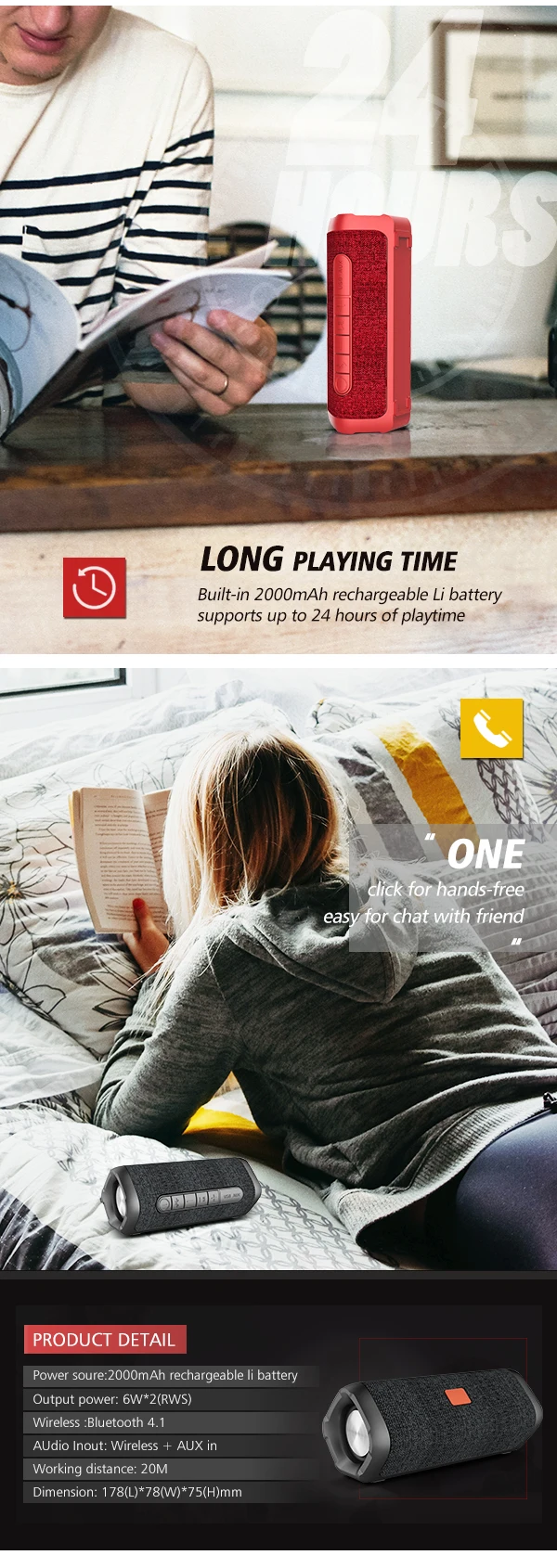 Модель изделия: EBS-605 Размер изделия: длина, ширина и высота: 175*68*68 мм Протокол Bluetooth: A2DP, AVRCP, HFP, HSP Решение Bluetooth/версия: действия 2815/4,2 версия Размер динамика: 45 мм Внутренний Магнитный * 2 (Неодимовый Железный бор внутренний магнитный) + 52 мм двойная басовая диафрагма Характеристики динамика: 4Ω/6 Вт * 2 Частотная характеристика: 68 Гц-18 кГц Искажение: ≤ 0.30% (1 кГц, 1 Вт) Отношение сигнал-шум: ≥ 73дб Уровень шума ≤ 0,8мв Номинальная мощность: 6 Вт * 2 THD + N ≤ 1% (1 кГц, 0 дБ) Расстояние передачи: от 10 до 15 метров Батарея Емкость: 2000 мА-ч/3,7 V (18650 Батарея) Номинальное напряжение: 5 В постоянного тока Зарядное напряжение/ток микро-usb 5В/1A Ток в режиме ожидания составляет менее 100μA Время зарядки: 3 ч Время работы: более 18 часов Функция коробки: Да Вызов по Bluetooth: короткое нажатие кнопки для телефонного звонка Аудио линейный вход: 3,5 мм Интерфейс Разъем для зарядного устройства постоянного тока в micro USB 5V/1A Индикатор зарядки красный светильник включен, когда зарядка находится в процессе, и он выключен, когда зарядка завершена Индикатор Bluetooth синий светильник быстро мигает перед подключением и медленно мигает после подключения Синий светильник с линейным индикатором Материал продукта и процесс ABS + резиновое масло + силиконовая кнопка Цвет изделия: черный/красный/ Вес готовой машины: 460 г Аксессуары для упаковки: 1 упаковочная коробка, руководство, 1 зарядный кабель, LIN IN кабель
