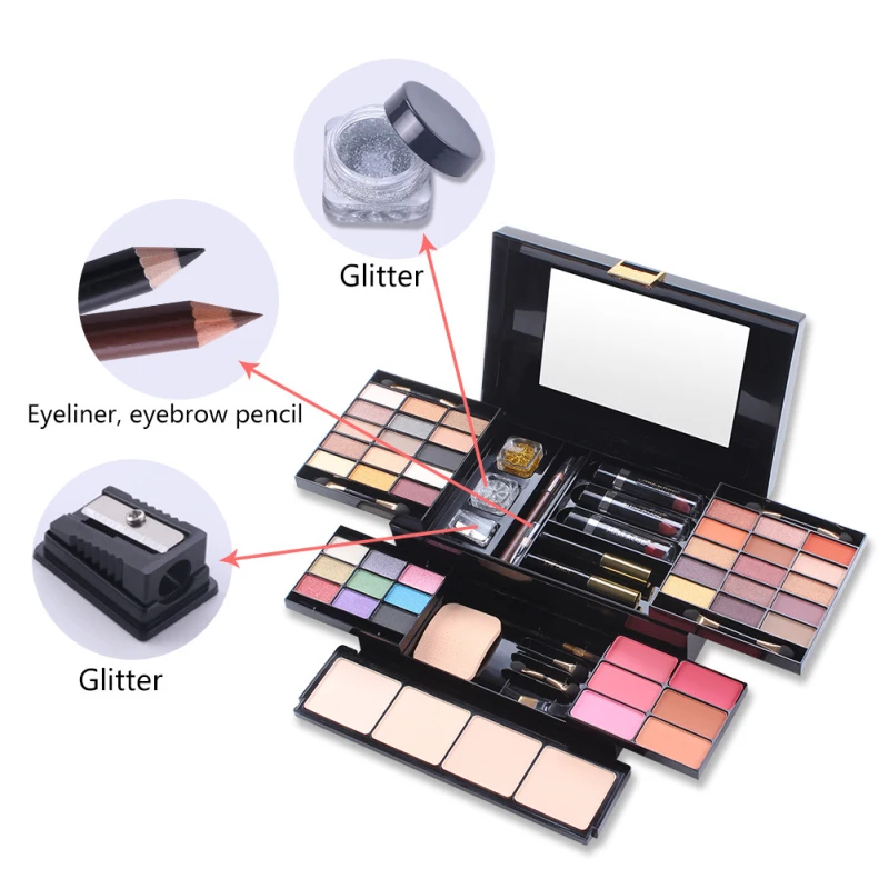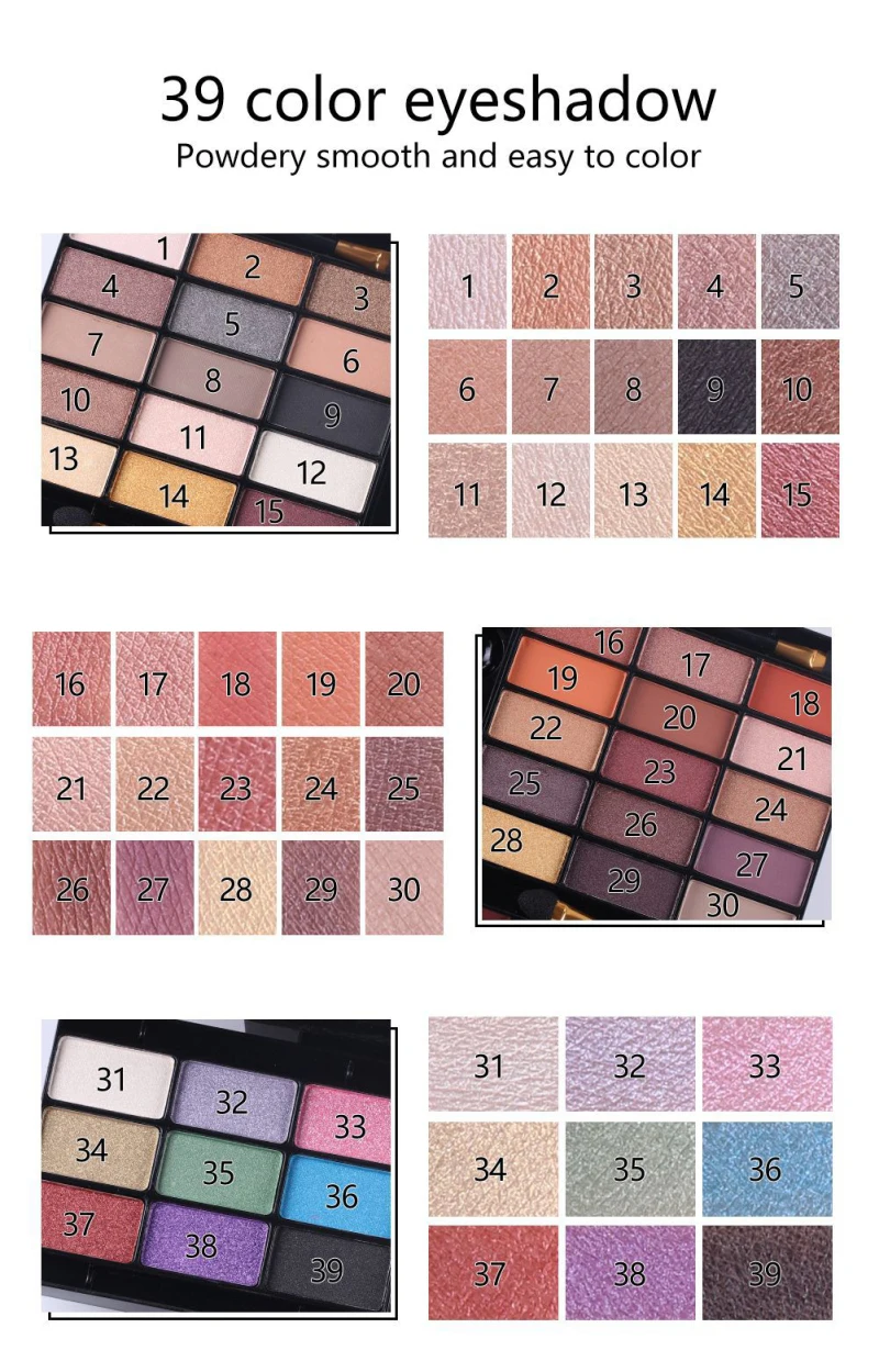 39 цветов Тени для век + 6 цветов румян + 4 цвета пудры + 3 цвета помады + 1 * подводка для глаз и подводка для губ + 2 цвета золотой пудры + подводка для глаз, тушь и Кисть для макияжа