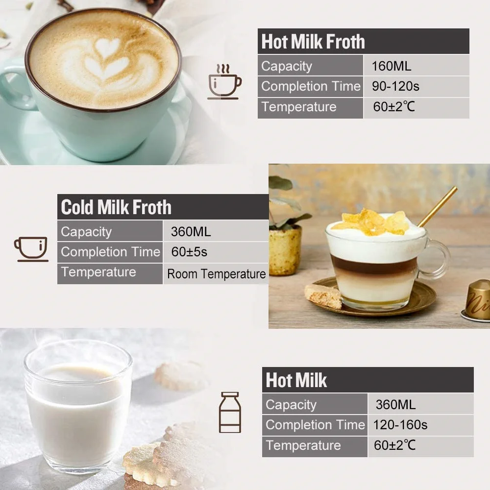 Лучшая температура молока для Caffe Latte или капучино составляет от 131 ℉ до 149 ℉. Электрический молочный вспениватель автоматически нагревает молоко до 140 ℉.