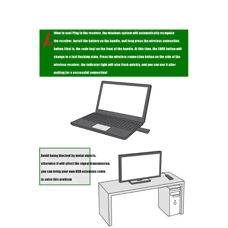 [How to use] Plug in the receiver, the windows system will automatically recognize the receiver, install the battery on the handle, and long press the wireless connection button on the front of the handle (that is, the code key). At this time, the X BOX button will become a fast flashing state. Press the wireless connection button on the side of the wireless receiver, the indicator light will also flash quickly, and you can use it after waiting for a successful connection!