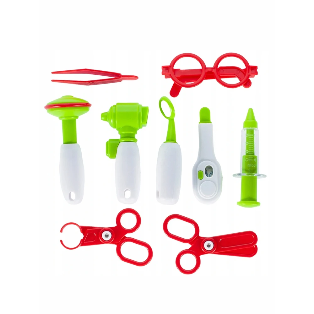 В комплект входит: пластиковый чемоданчик с ручкой и ремешком, молоточек, стоматологическое зеркало, ножницы, очки, отоскоп, пинцет, зажим, градусник, шприц, 2 полочки и держатель с крючками для инструментов. Размеры чемодана: 24х19х9 см.