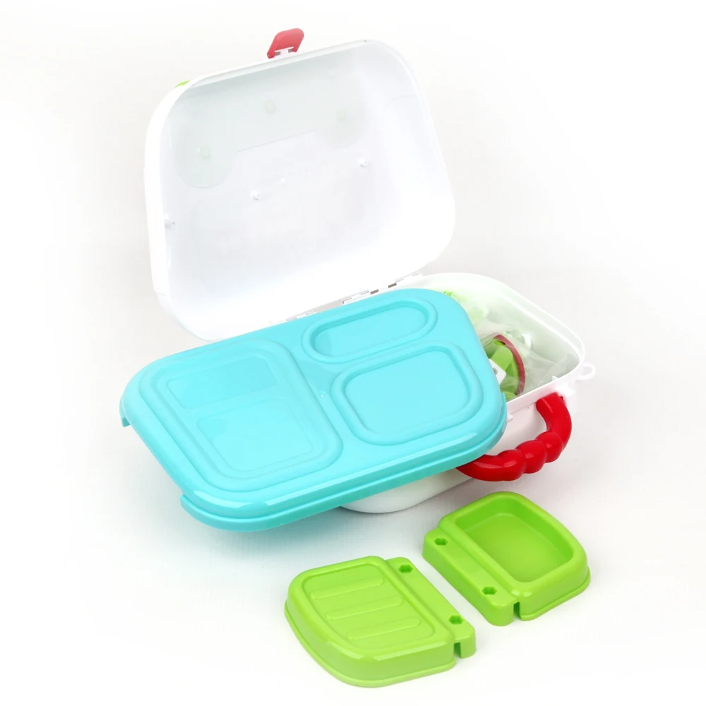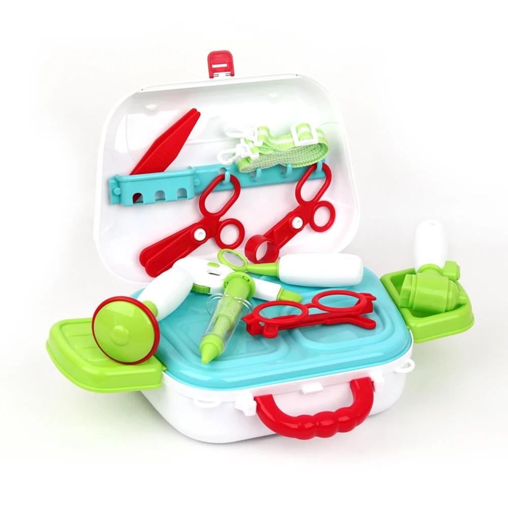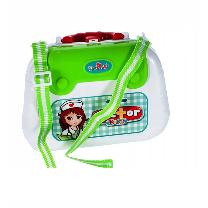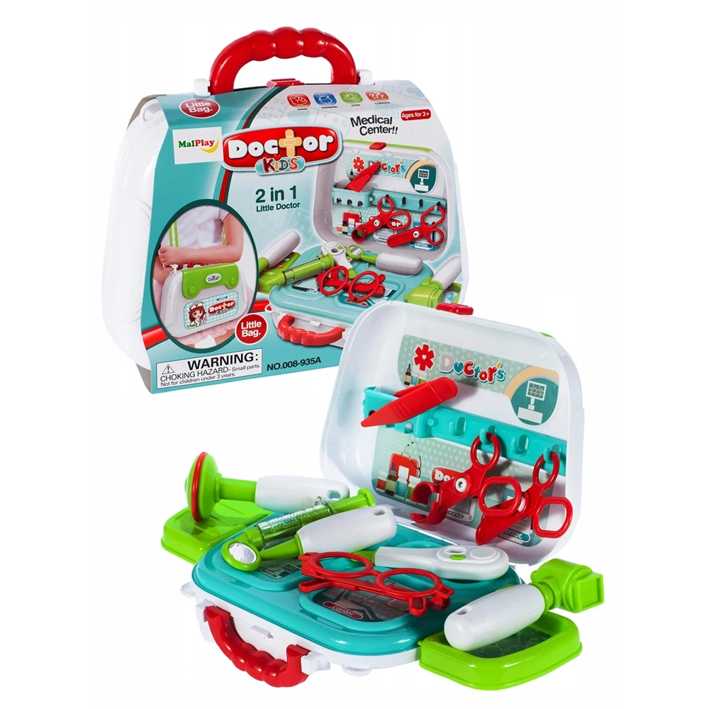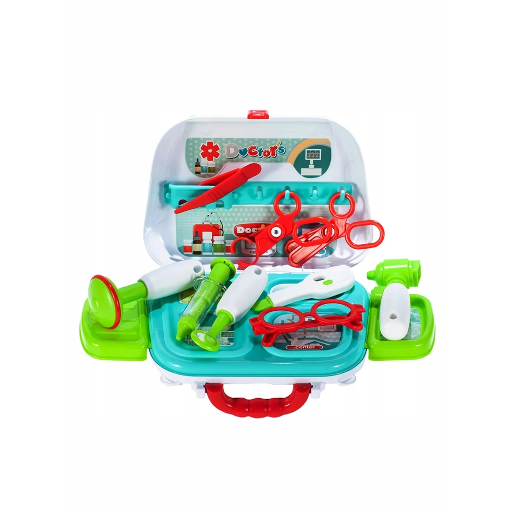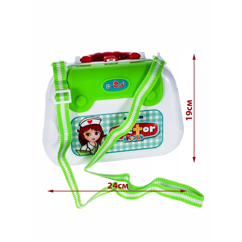 Набор доктора включает в себя удобный чемоданчик и медицинские инструменты. У чемодана есть ручка для переноски на плече.