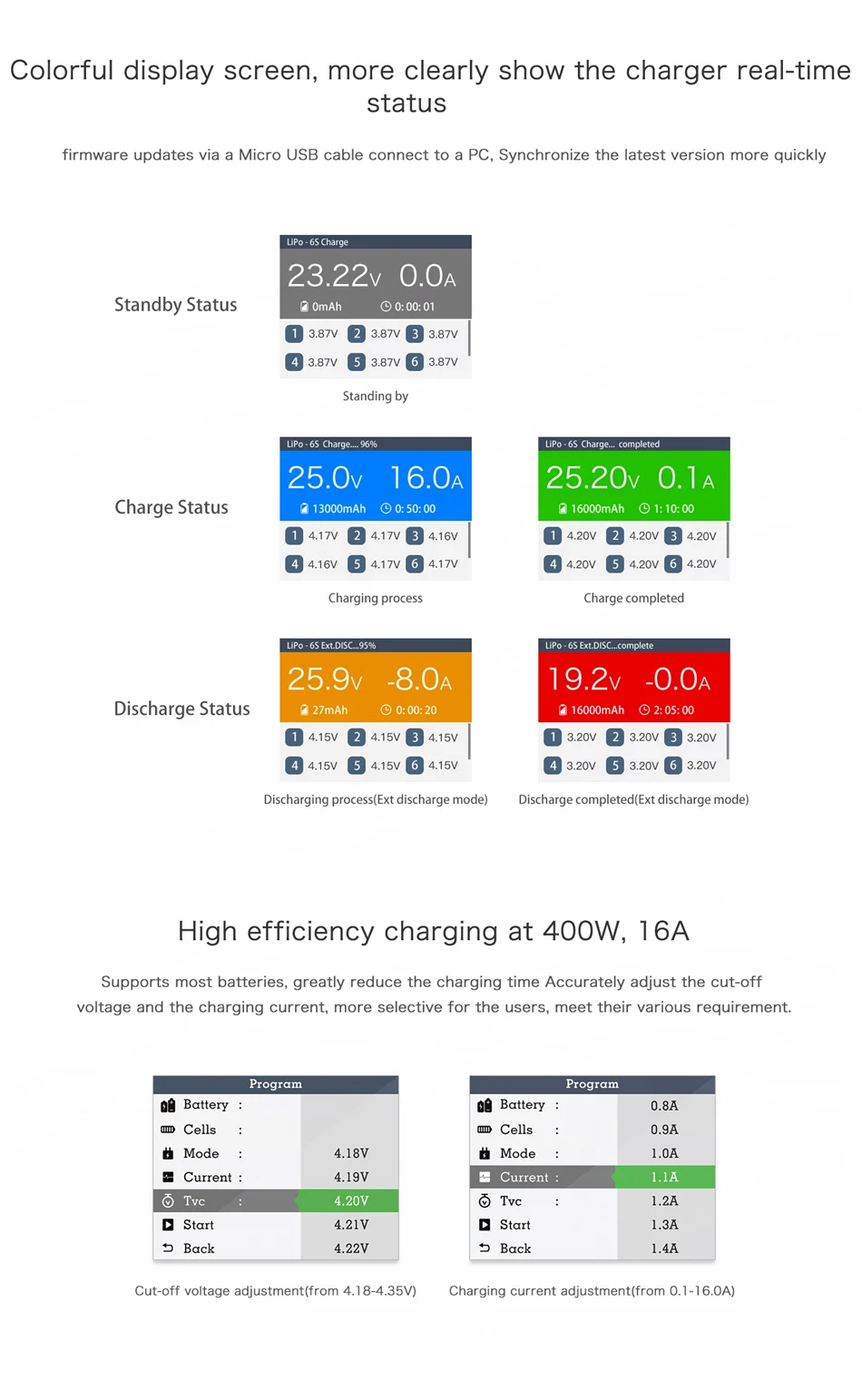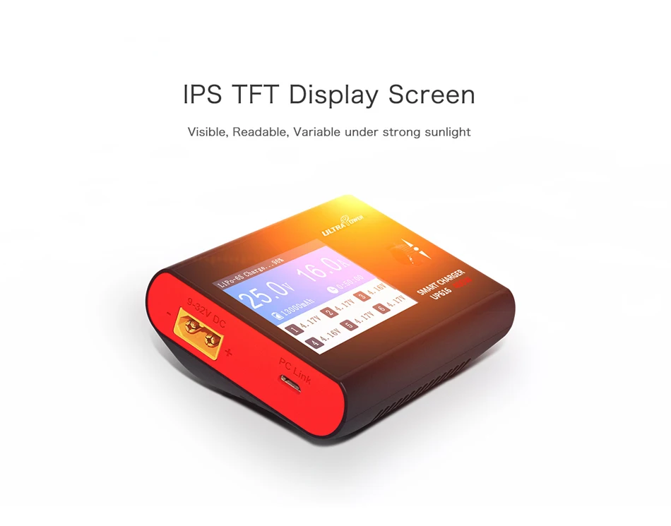 Четыре режима работы, просто управляется одним ключом челнока. Экран IPS TFT виден, читаемый, переменный под сильным светильник. Сильный чип обеспечивает высокую производительность, стабильное качество. Обновление прошивки через кабель Micro USB Подключите к персональному компьютеру, Синхронизируйте последнюю версию быстрее. Он поддерживает 1-6s срок службы/LiIo/LiPo/LiFe/LiHv батареи, 1-1 6s NiCd/NiMH батареи или 1-12s Pb батареи. Новая Специальная функция: функция внешнего разряда.