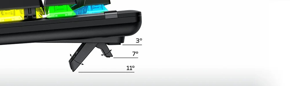 Отрегулируйте двухступенчатые ножки клавиатуры для трех различных настроек угла (3 °, 7 ° или 11 °), в зависимости от того, что делает ваши запястья наиболее удобными.