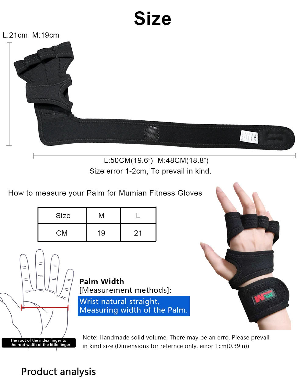 L :17-19cm, XL:19-21cm Product information: Color: Black,Black green Size: L:17-19cm, XL19-21cm Material: Cloth, Silicone Features: Suitable for running, climbing, cycling, body-building, fitness exercises, etc Adjustable gloves, easy to wear and take off Hollow-out design on the back of the hand, breathable and flexible With non-slip silicone pad, wear-resistant It absorbs sweat and reduces hand wear, while maintaining hygiene Package included: 1 pair of gloves