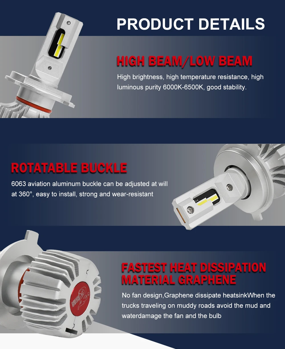 Рабочее напряжение: 16-100 В постоянного тока; Мощность: 40 Вт 8000LM Светодиодный чип: cree 3570 Срок службы: 30000 ч Рабочая температура:-40 °-85 ° Материал держателя: авиационный алюминиевый сплав 6063; Цветовая температура: 6000K-6500K Графеновая теплопроводность и теплоотдача Безвентиляторная естественная лампа рассеивания тепла