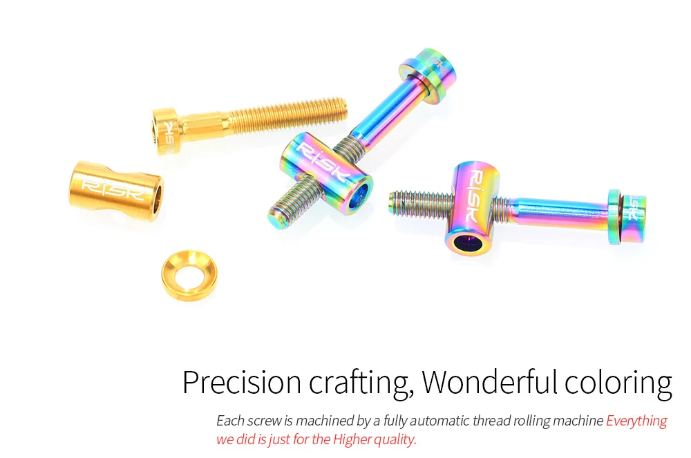 Поверхность винтов из титанового сплава окрашена технологией вакуумного нитрида PVD и плотным покрытием, состоящим из олова, TIALCN и другие соединения образуются на поверхности винта для улучшения износостойкости и твердости поверхности, а также делает винты более красивыми и долговечными, не выцветают.