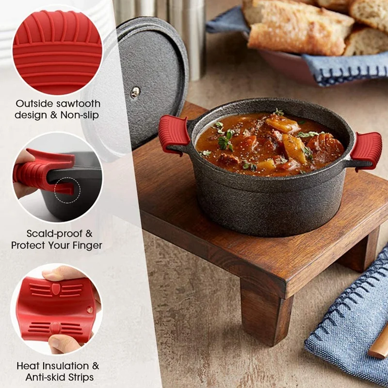 Удобное ощущение руки: легко держать силиконовый вспомогательный кронштейн ручки. Рамка крышки горячей ручки близко к вашей чугунной сковороде. Специально разработанный рисунок имеет нескользящую текстуру. Внутренний силиконовый ребро ручки безопаснее при перемещении тяжелых горячих кастрюль и может эффективно предотвратить падение.
