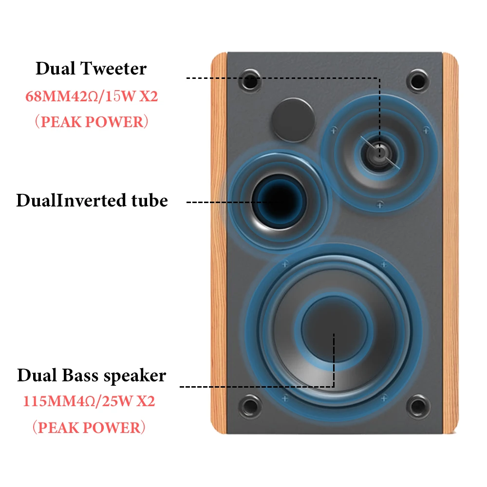1. Аудиовход: Bluetooth / LINE1 / LINE2 / fiber / USB2. Режим управления: инфракрасный пульт дистанционного управления + кнопка панели3. Режим отображения: RBG светодиодный индикатор состояния4. Мощность: 2X25W + 2X15W (80W)5. Искажение: <1%6. Частотная характеристика: 40 Гц-20K Гц7. Отношение сигнал-шум: ≧ 85 дБ8. Динамик: твитер ø68мм, 4Ω/15 Вт X2Бас ø115мм, 4Ω/25 Вт X29. Перевернутая трубка: переменная кривизна Передняя перевернутая трубка X210. Входная мощность: DC19V/1.89A переходный ток 5A11. Канал: 2,0 стерео12. Хост и вспомогательный Размер: 175 мм * 248 мм * 155 мм (Д * Ш * В)13. Материал: МДФ + тканевая сетка14. Способ установки: Рабочий стол