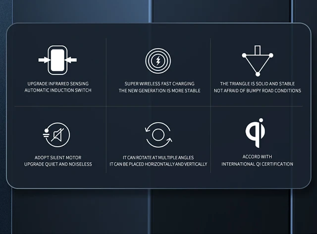 Вращающаяся на 360 градусов Колыбель обеспечивает гибкий выбор просмотра вашего телефона или GPS во время вождения. Это означает, что не будет заблокировано видение, и вы можете получить идеальный угол обзора с автомобильным беспроводным зарядным устройством.