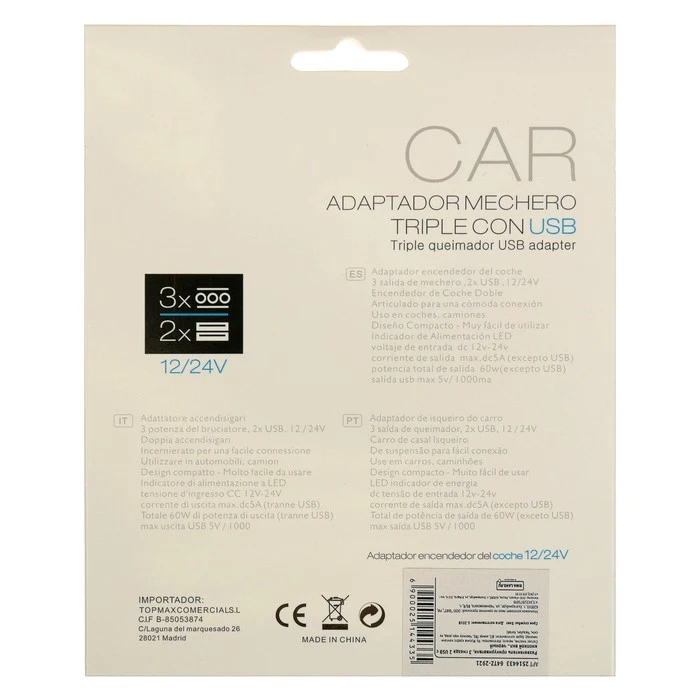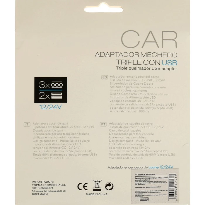 Разветвитель прикуривателя, 3 гнезда с подсветкой, 2 USB, 12/24 В, провод 70 см
