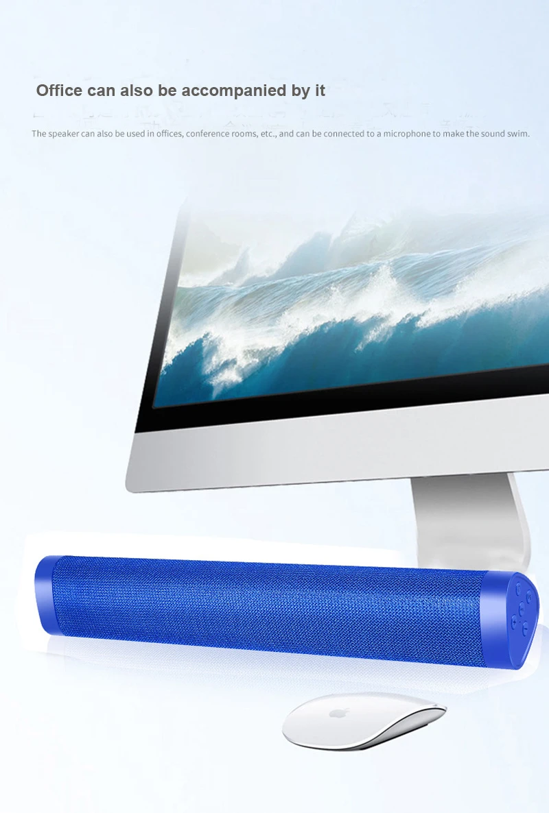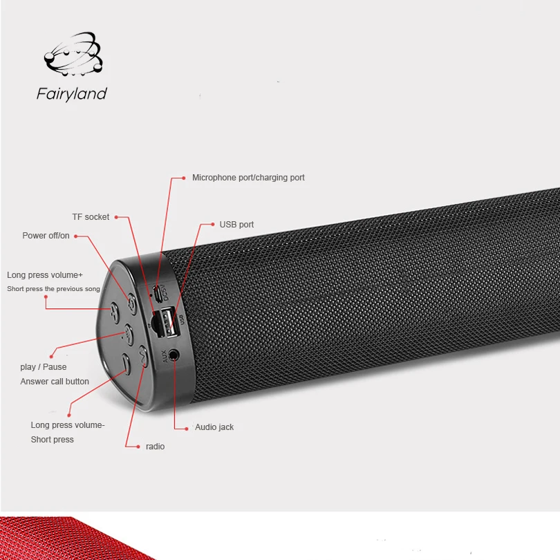Батарея: перезаряжаемая литиевая батарея Емкость аккумулятора: 1200 мАч, Время работы: 4-6 часов Режим воспроизведения: bluetooth, TF, режим USB диска, режим аудио линии Версия Bluetooth: V5.0 Дальность передачи Bluetooth: 10 метров Частотный диапазон отклика: 20 Гц-18 кГц Отношение сигнал-шум: ≥ 80 дБ Сертификат: ROHS, CE Характеристики динамика: 55 мм, 4Ω/3 Вт * 2 Размер: 42*7*7 см