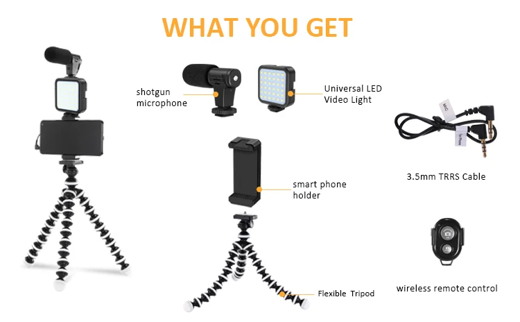 Набор для видеозаписи предназначен для улучшения ваших видео с лучшим звуком и светильник щением в помещении или на улице, он оснащен универсальным микрофоном для работы с любым смартфоном или камерой, светодиодный светильник с 36 супер яркими светодиодами, Штатив, который можно использовать в качестве штатива для видео, и адаптер для смартфона со встроенным башмаком, который позволяет устанавливать не только ваш телефон, светильник, либо микрофон.