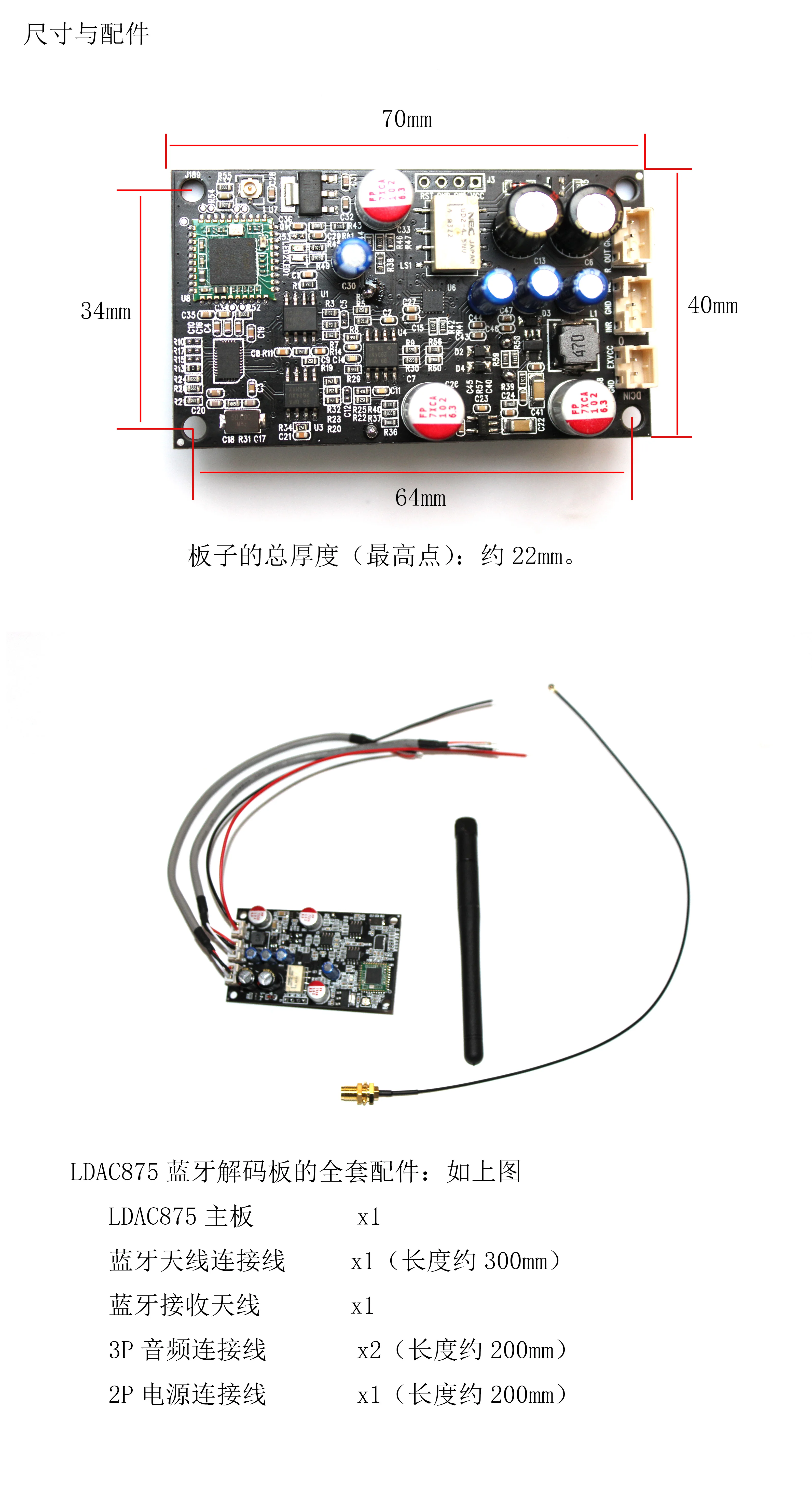 JC-LDAC875. Аудиофиловая плата приемника Bluetooth Bluetooth поддерживает протокол LDAC/APTX-HD/APTX-LL/ APTX/SBC/AAC JC-LDAC875 плата Bluetooth аудио приемника, которая использует чип CSR8675 Чехол предназначен для приема цифрового аудиосигнала Bluetooth и передачи его ESS с помощью коаксиального цифрового сигнала SPDIF. Чип 9038Q2M декодирует, Выходной аналоговый аудиосигнал фильтруется и усиливается 3 двойными операционными усилителями. Модуль LDAC875 поддерживает беспроводной прием Bluetooth и аналоговый вход AUX Выход переключателя. Реле используется для переключения без потерь, что не повлияет на качество звука. Бесшумный модуль Рассмотрите режим AUX line, режим переключения-это автоматическое переключение, приоритет Bluetooth. Компания запустила Модуль LDAC875-это версия высокого уровня, которая поддерживает LDAC/APTX-HD/APTX-LL/ Протокол APTX/SBC/AAC, максимальная частота дискретизации 24 бит/96 кГц, далеко за пределами APTX-HD имеет частоту дискретизации 24bit/48knz. L DAC875 является DC одиночные источника питания, широкий диапазон напряжения DC 10V-32 в пост может сделать Продукт разработан с изолированным модулем регулятора питания, который может быть непосредственно установлен в оригинальном усилителе мощности или на предварительной стадии Оборудование напрямую распределяет источник питания, поэтому независимый источник питания больше не требуется. Он также может быть использован для модификации транспортного средства, Плата поставляется с изолированным модулем регулятора напряжения питания, который может быть непосредственно подключен к источнику питания 12 В на автомобиле. Многоуровневая стабильность Конструкция напряжения, модуль Bluetooth, чип DAC, чип op amp-это все независимые чипы управления питанием Op amp принимает двойной (положительный и отрицательный) Источник питания 14 в и предназначен для абсолютного уровня температуры. ①. Входной интерфейс постоянного тока, красный (EXACC) положительный, черный (GND) отрицательный. Поддержка DC10V-32V. Примечание: мощность переменного тока не может быть использована. ②. AUX аналоговый аудио входной интерфейс, белый провод (INL)-левый канал, черный (GND)-аудио заземляющий провод. Красный (INR)-правильный канал. Примечание: провод заземления не может быть неправильно подключен. ③. Интерфейс аудиовыхода, белая линия (L-OUT) является левым каналом, а черный (GND) Аудио заземляющий провод, красный (R-OUT) является правильным каналом. Примечание: провод заземления не может быть неправильно подключен. ④. Внешняя антенна-пряжка Bluetooth, антенна с пряжкой может быть непосредственно прикреплена, а антенна 2,4G может использоваться. Модуль должен быть установлен с внешней антенной в металлический чехол, в противном случае расстояние приема будет серьезно зависеть. ① Bluetooth-решение CSR8675, поддержка LDAC/APTX-HD/APTX-L/APTX/SBC/AAC, поддержка LDAC 24 бит/96 кГц частота дискретизации. ② Чип декодера ESS9038Q2M, высокочастотный ЦАП с высоким разрешением, поддержка до 32 бит/384 кГц ③ Три выхода фильтра операционного усилителя 0PA2604AU, два рядом с чипом декодера DAC-это фильтры I/V с левым и правым каналом, один Каждый чип отвечает за один звуковой канал, с лучшим разделением. Последний-это левый и правый канальный усиленный выход для улучшения динамики и тяги ④Схема преобразования мощности преобразует входной источник питания в двойной (положительный и отрицательный) 14 в Регулируемый источник питания постоянного тока для питания к 