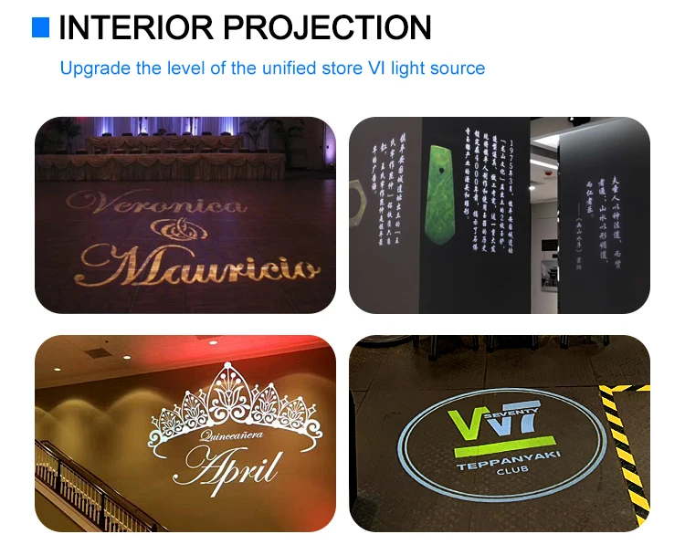 * To project the theme of the events, party, activities, meeting, events... * To project the virtual marking on floor/wall for warning, guide in mall, warehouse, road... * To project the name of bride and groom on wedding time
