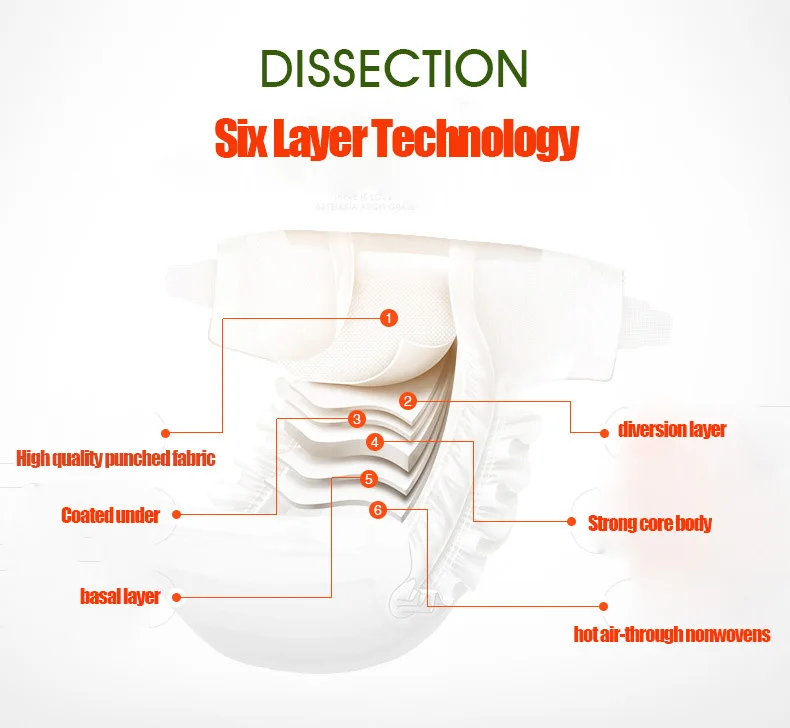 5. Структура подгузников и подтягивающих штанов в основном аналогична, в основном включает в себя нетканый поверхностный слой, поглощающий слой, нижнюю пленку трех основных структур, а также эластичную талию, двухслойная защита от утечки и другие детали дизайна.