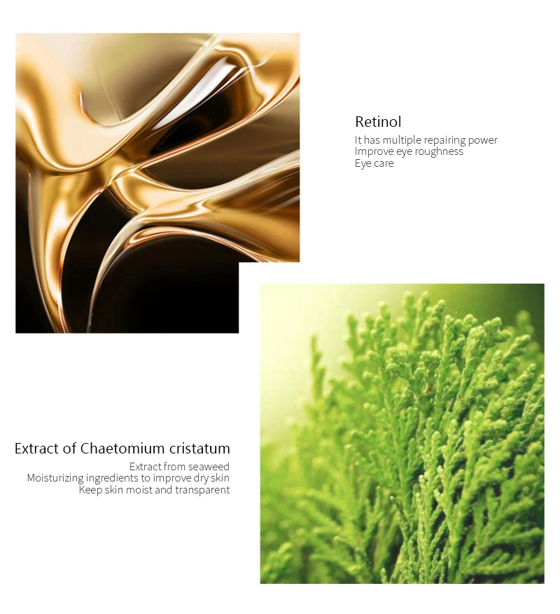 1. Увлажнение: повышают эластичность кожи, смягчают мешки под глазами, улучшают темные круги, лечат усталость глаз, уменьшают отечность, разглаживают гусиные лапки и тонкие линии с уникальным сочетанием натуральных ингредиентов