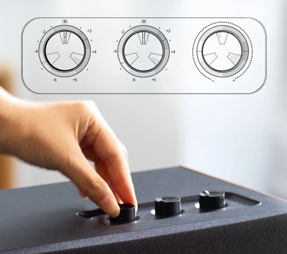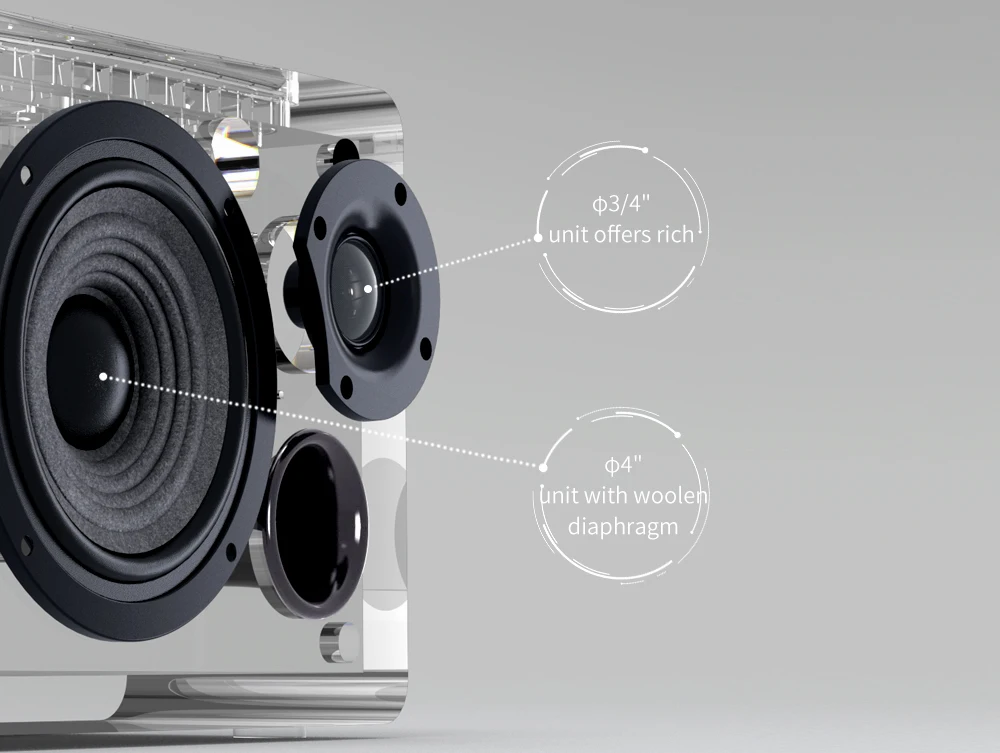 Динамики D12, сделанные с 4 звуковыми блоками, обеспечивают красиво сбалансированный звук с высокой низкой частотой и более глубокими тонами, ранее не находившимися в традиционных настольных динамиках.