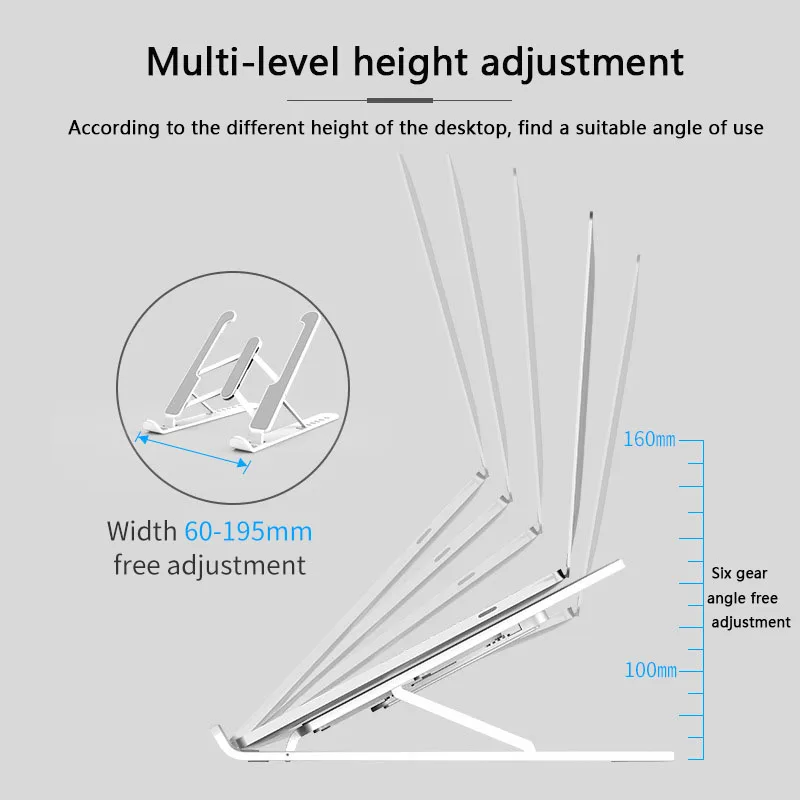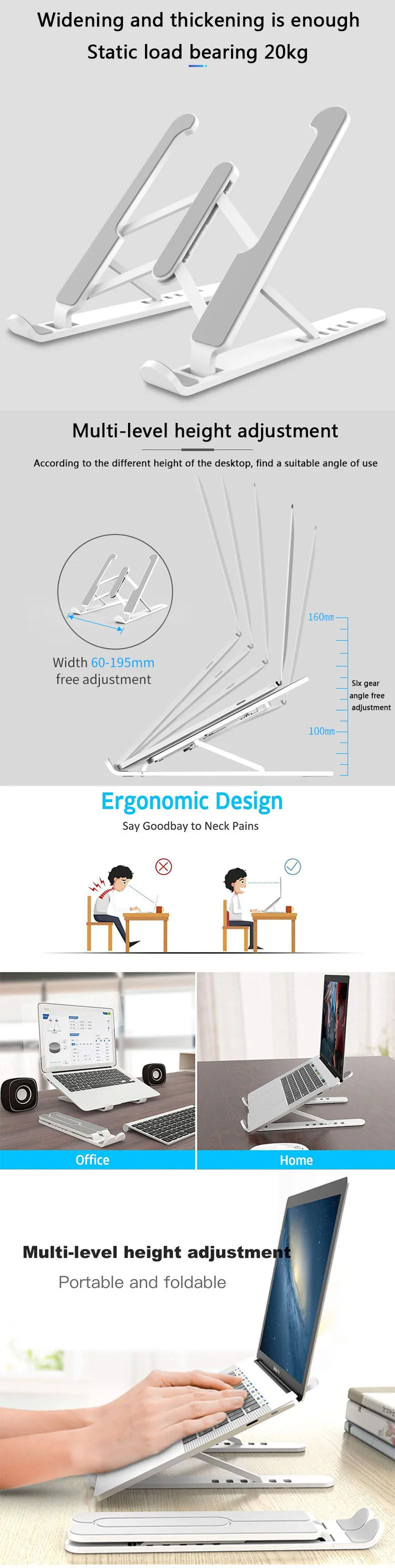 1. Название продукта: стойка для ноутбука 2. Материал: АБС + алюминиевый сплав 3. Функция: кронштейн для ноутбука и охлаждающая подставка