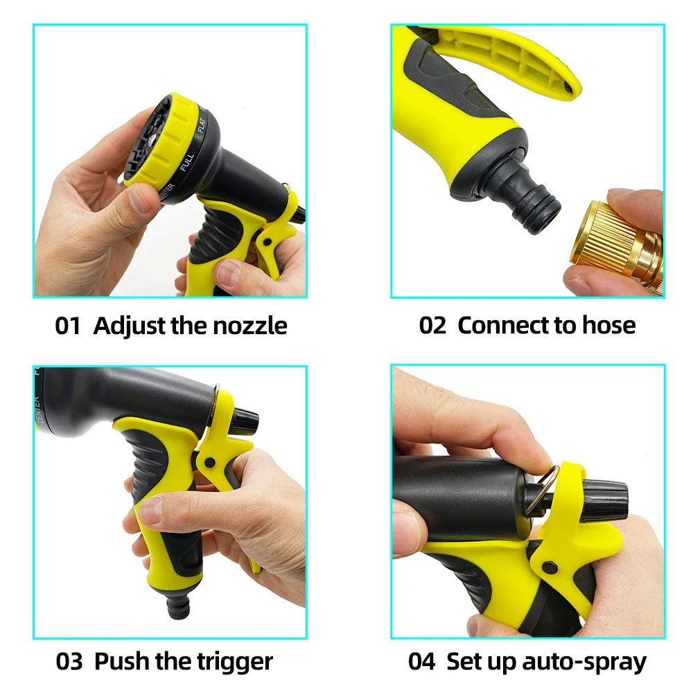 Данный прибор имеет 9 различных режимов распыления воды. И вы можете легко менять на разные режимы, переключая головку водяного пистолета. Удобно использовать и менять для любых условий.