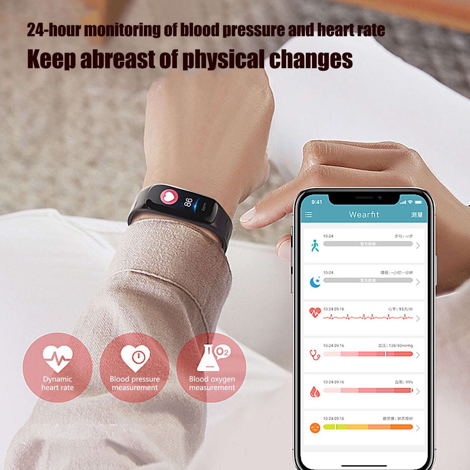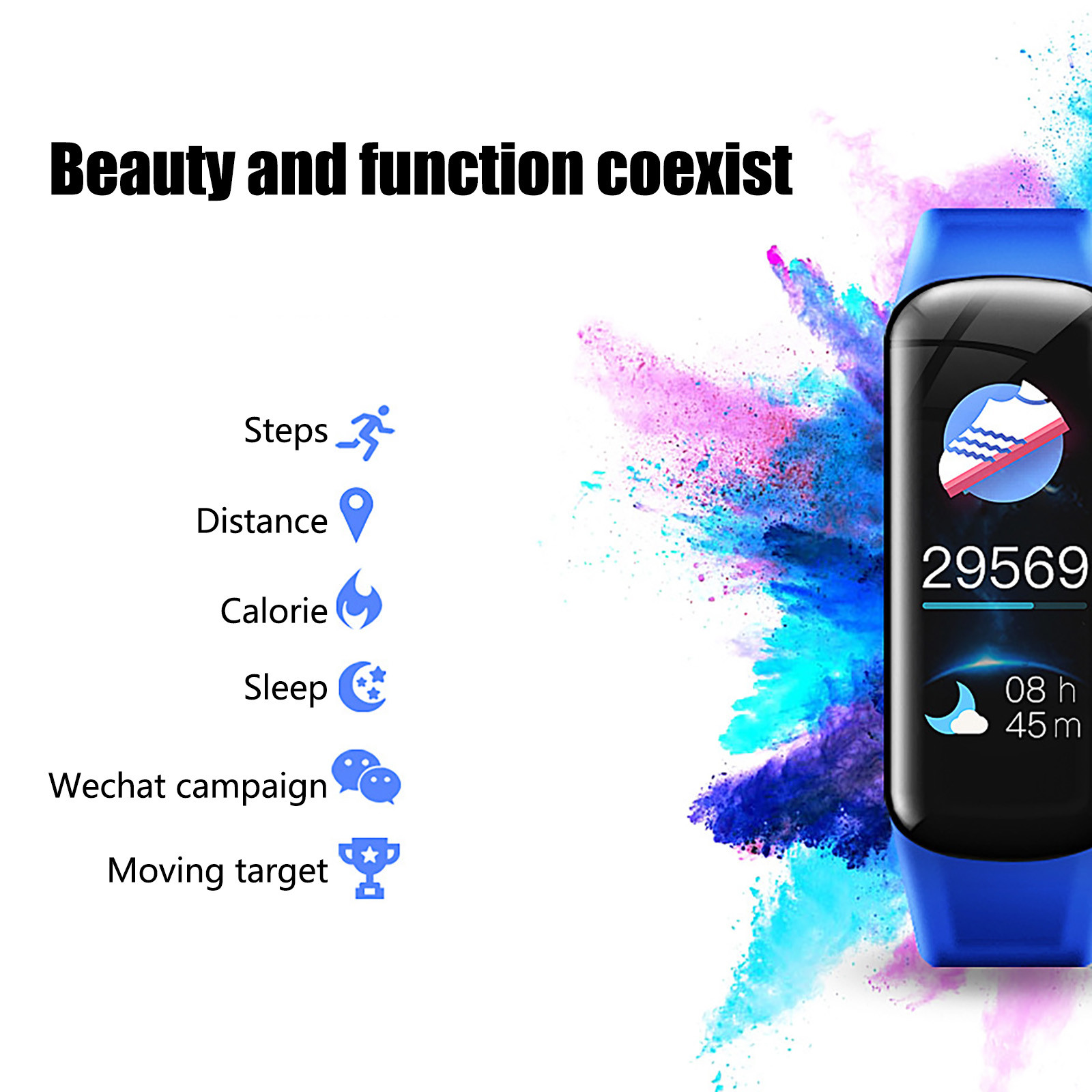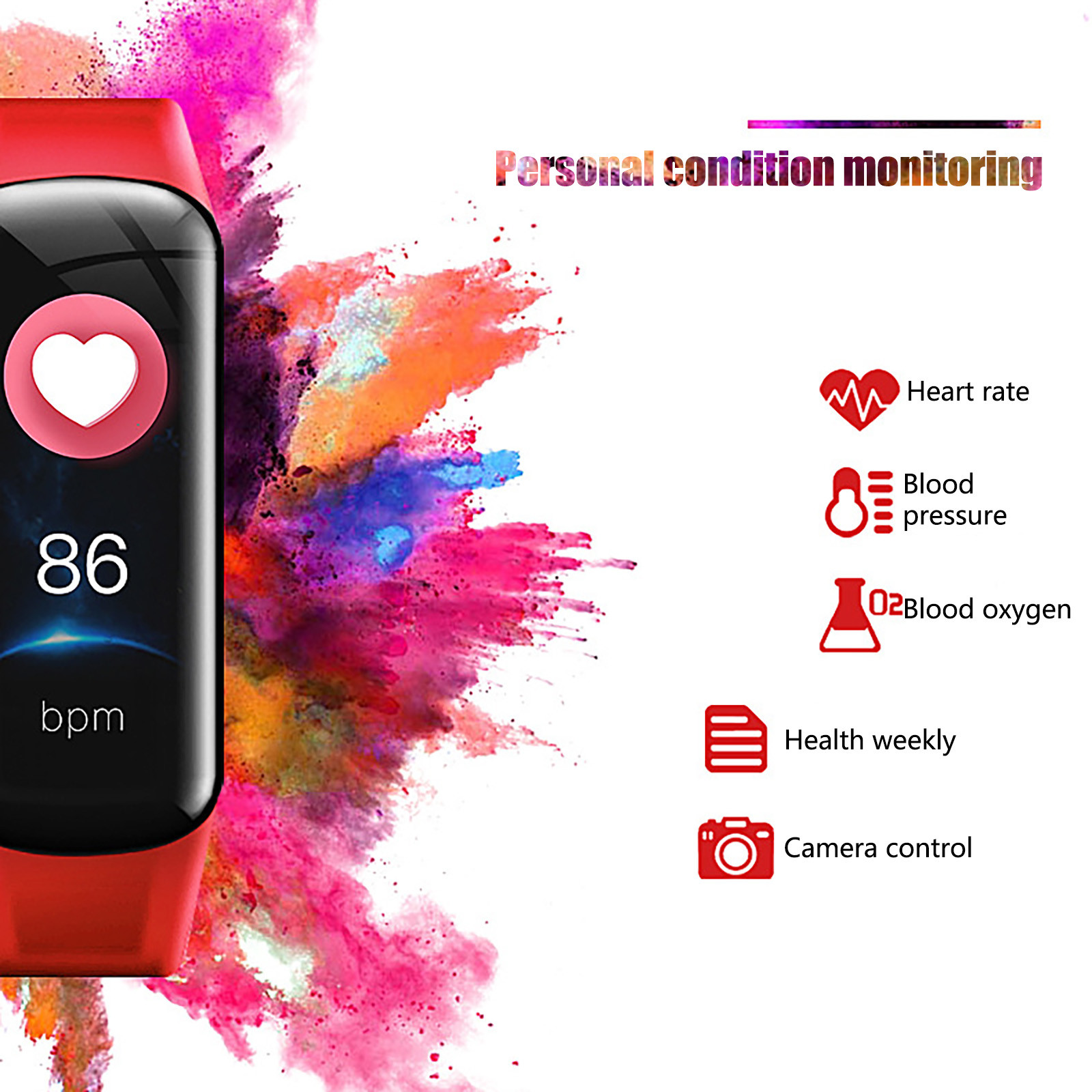 Functions: Heart rate monitor, stopwatch, pedometer, calories, distance calculation, heart rate, blood oxygen, blood pressure, phone and text message reminders, and remote camera, etc. (requires APP connection), IP67 waterproof