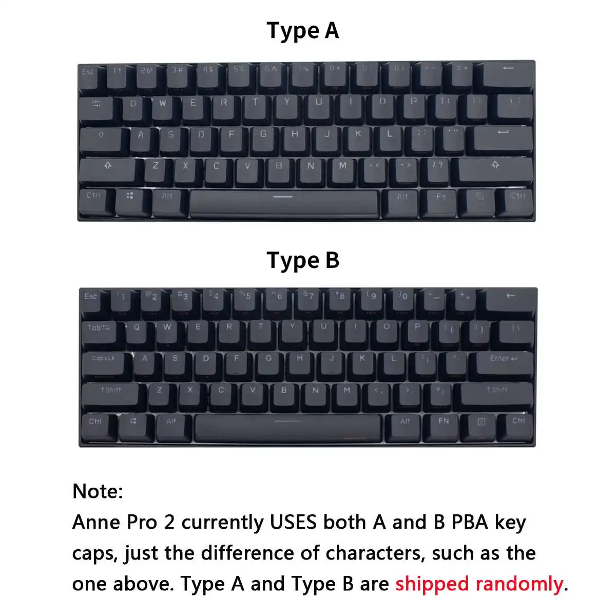 Anne Pro 2 в настоящее время использует и A и B PBA ключевые колпачки, только разница символов. Тип A и Тип B отправляются случайным образом.