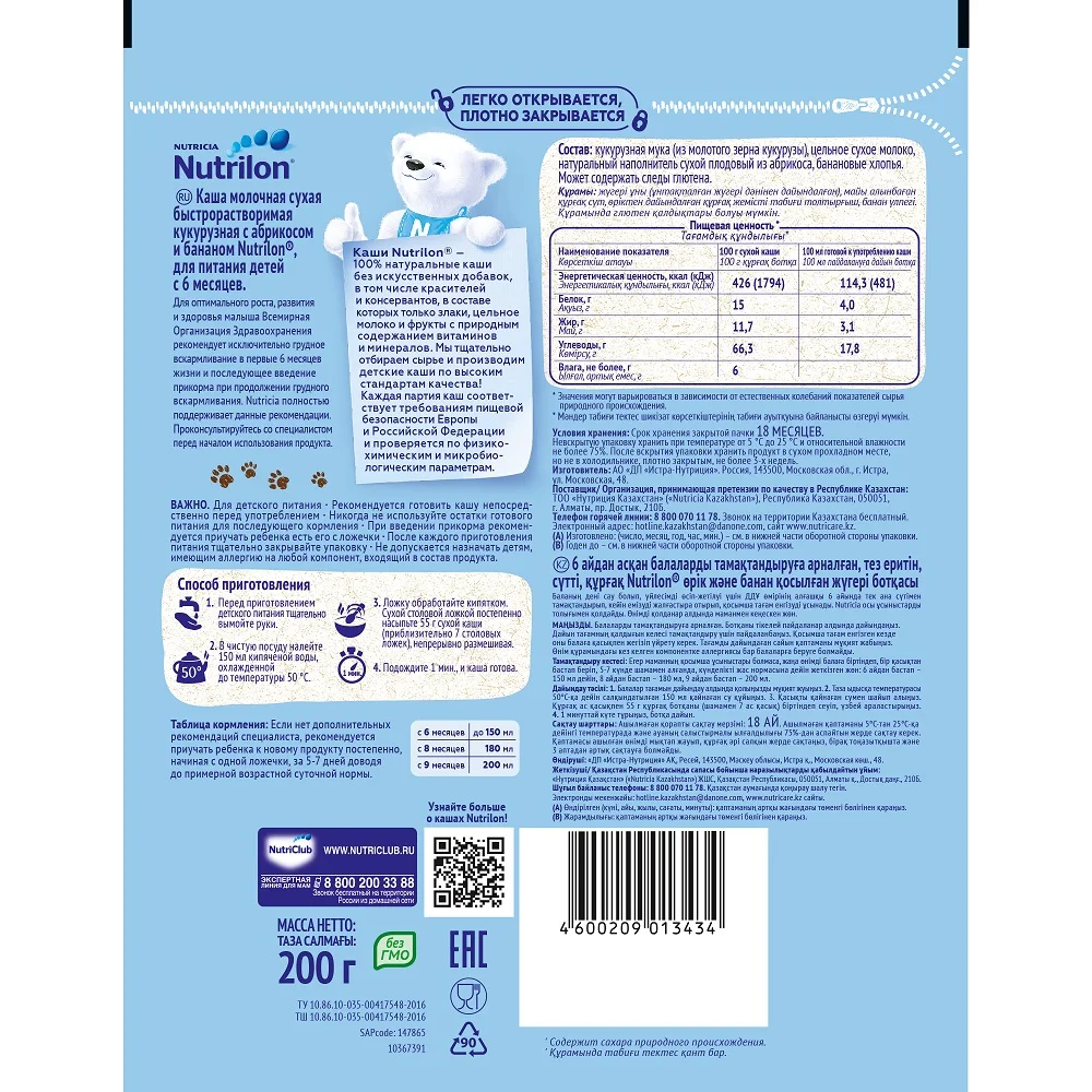 Каши Nutrilon – 100% натуральные каши без искусственных добавок, в том числе красителей и консервантов, в составе которых только злаки, цельное молоко и фрукты с природным содержанием витаминов и минералов. Мы тщательно отбираем сырье и производим детские каши по высоким стандартам качества! Каждая партия каш соответствует требованиям пищевой безопасности Европы и Российской Федерации и проверяется по физико-химическим и микробиологическим параметрам.