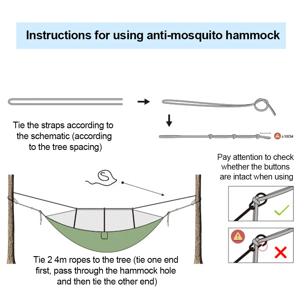 4. Аксессуары для гамака: гамак оснащен сумкой для хранения, ремнем и карабином, другие инструменты не требуются. С сеткой от насекомых, она подходит для кемпинга, пеших прогулок, путешествий, пикника в дикой природе, а также может быть установлена на заднем дворе.