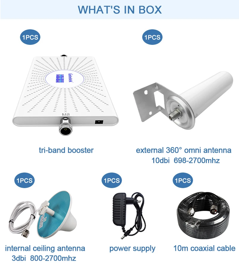 1. CDMA 850 2G GSM 900 4G LTE 1800 3G WCDMA 2100 трехдиапазонный ретранслятор 2. Шнур питания переменного тока и инструкция по эксплуатации 3. Внешняя всенаправленная антенна на 360 ° 4. Внутренняя потолочная антенна 5. Кабель 10 м
