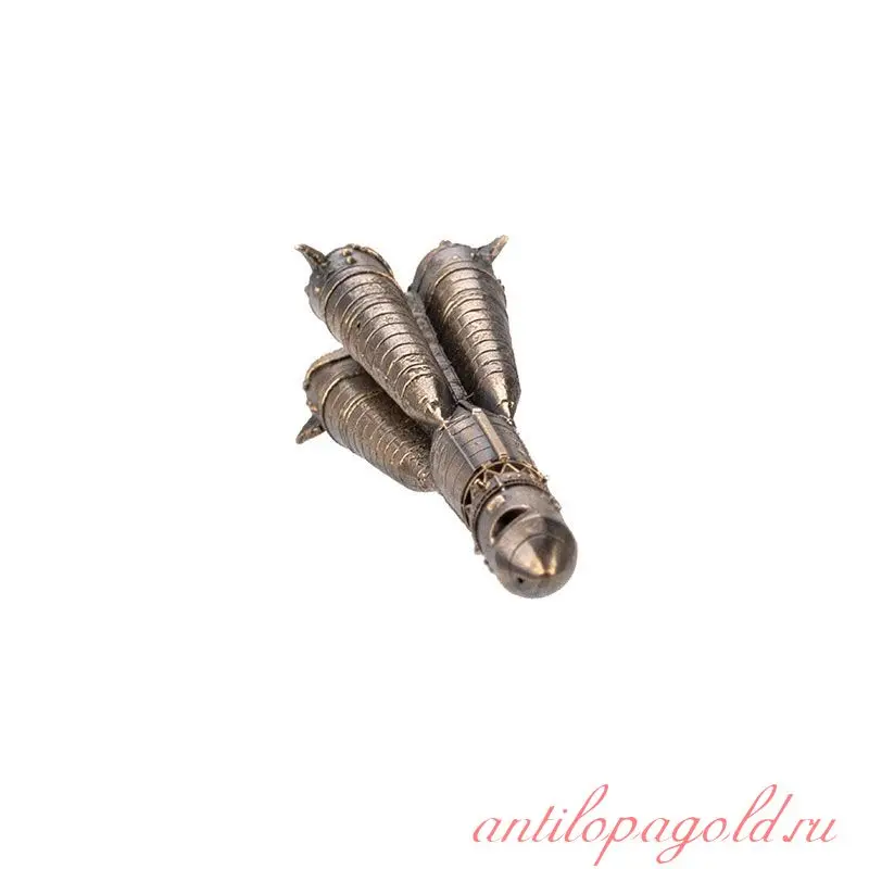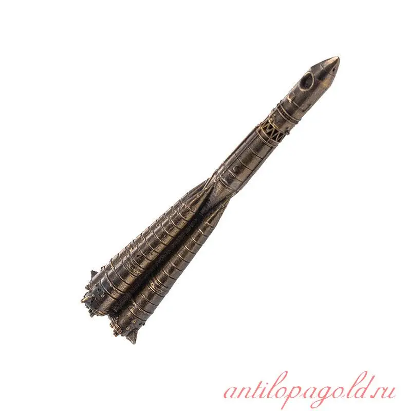 Масштабная бронзовая модель советского трехступенчатого ракета-носителя "Восток", созданного на базе семейства ракет Р-7 с керосиновым топливом. Данный ракета-носитель мог выводить на орбиту полезную нагрузку массой до 4730 кг и использовался для запусков космических аппаратов серий "Восток", "Луна-1" - "Луна-3", спутников серий "Космос", "Метеор" и "Электрон". На нём же 12 апреля 1961 года был совершен первый в мире пилотируемый космический полёт Юрия Алексеевича Гагарина. Разработчиком и изготовителем данных ракет выступило ОКБ-1 под руководством С. П. Королёва. Модель выполнена из патинированной бронзы.