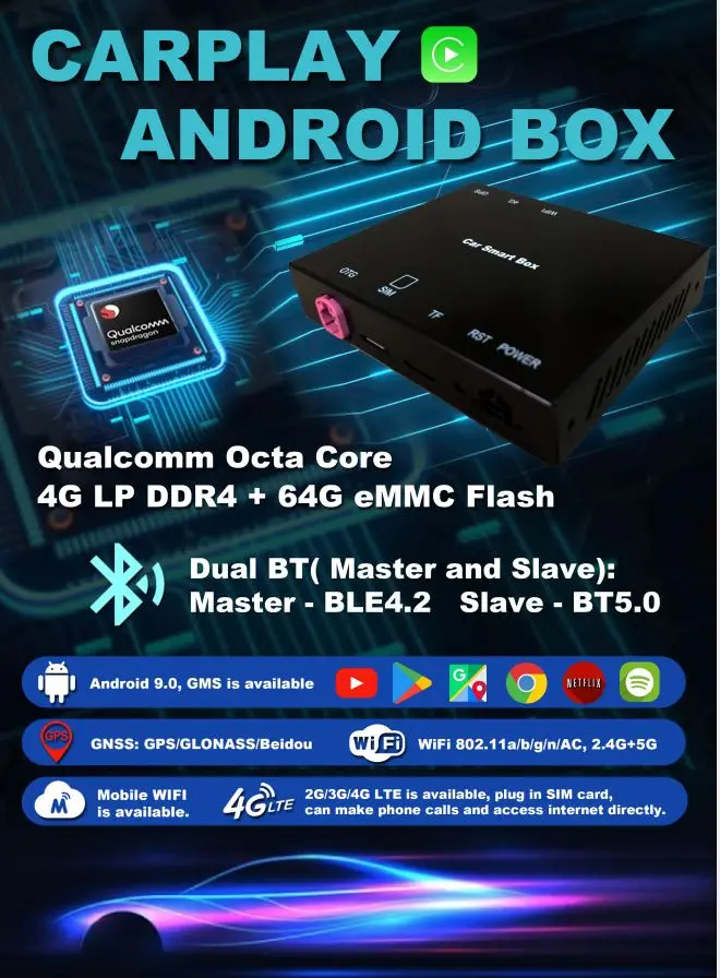 ApplePie CarPlay Android Box, которая передает потоковое видео, аудио и данные управления (например, touch, кнопки на руле, управление ручкой и так далее) через интерфейс OEM CarPlay USB OTG в автомобиле и зеркальное отображение всей системы Android на экран OEM. Вы можете управлять и управлять Apple Pie на oem-экране, мощное декодирование видео и возможность воспроизведения, полностью открытая среда приложения программного обеспечения.