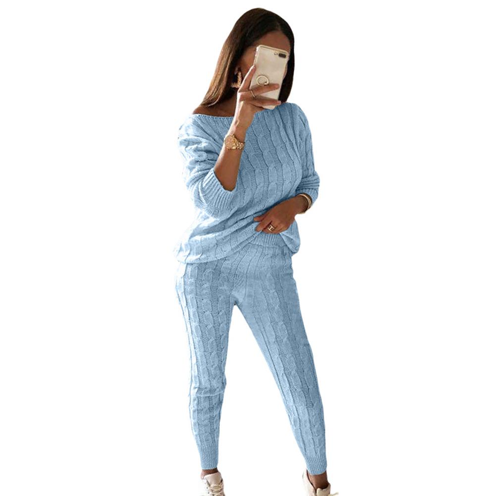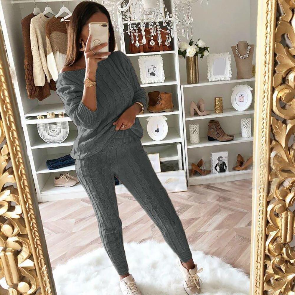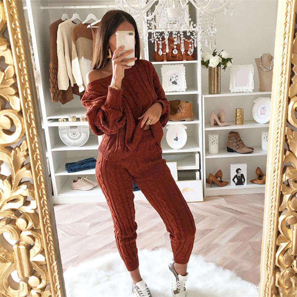 Комплект из 2 предметов, осенне-зимние вязаные наряды, женские брючные костюмы, сексуальные свитера на одно плечо, обтягивающие штаны, комплект из двух предметов, женские спортивные костюмы