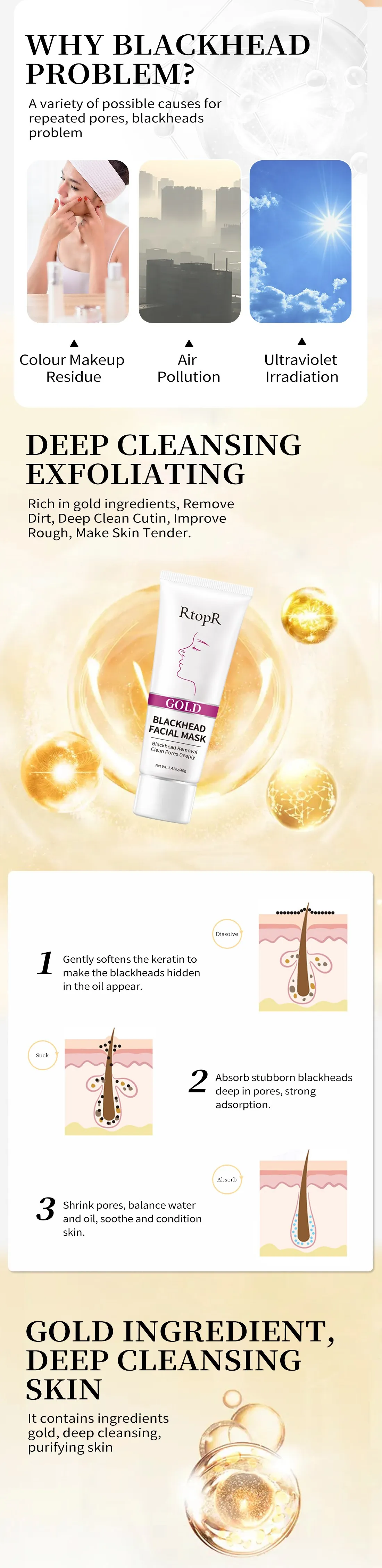 Содержит золотые ингредиенты, сотрудничая с различными питательными и косметическими ингредиентами, паста мягкая и деликатная, которая помогает очистить черную голову и грязь в пор, очистить отходы кутина и косметические остатки, И улучшает грубость, прозрачность мышц, контроль жирности и тонкой кожи, Чтобы сделать кожу нежной и прозрачной.