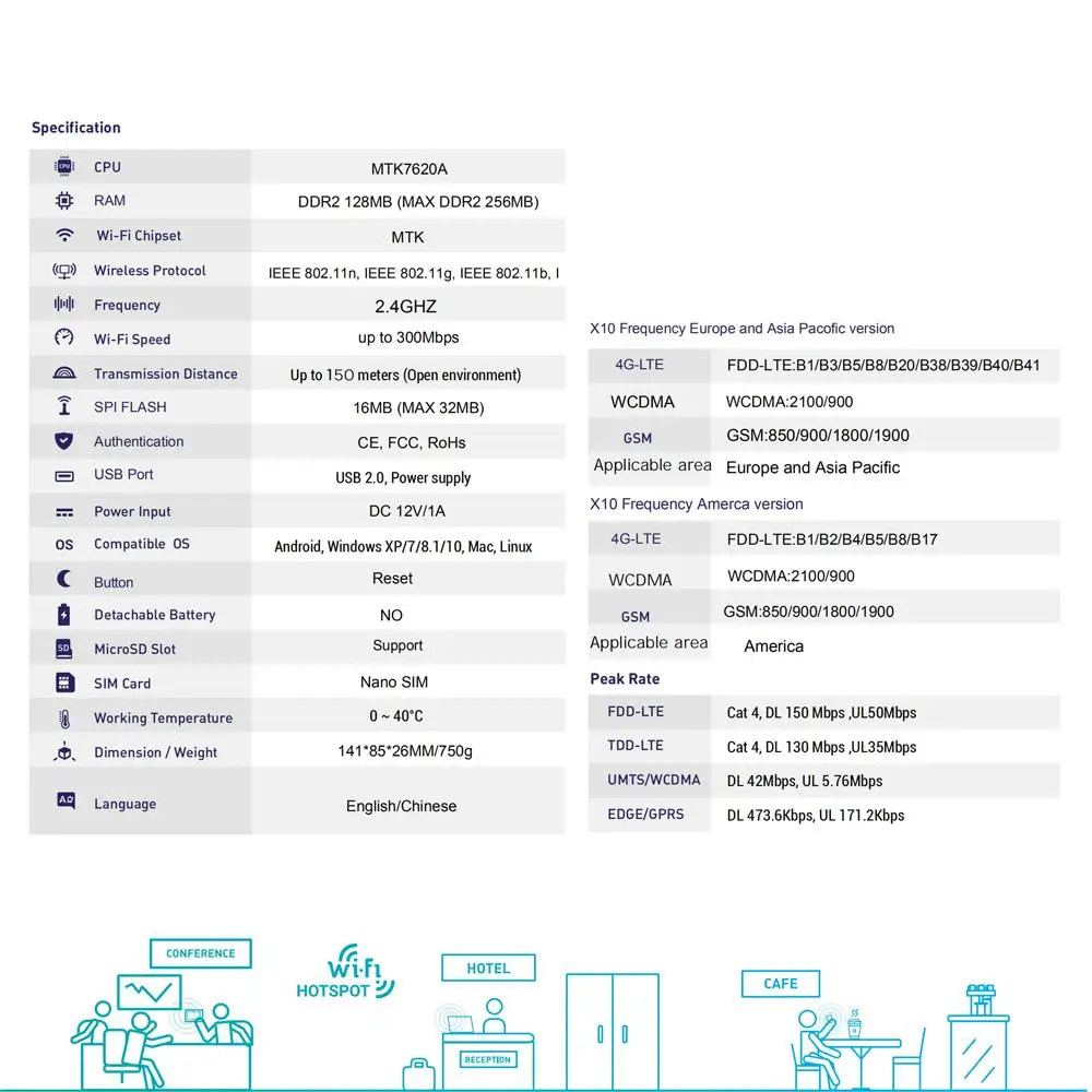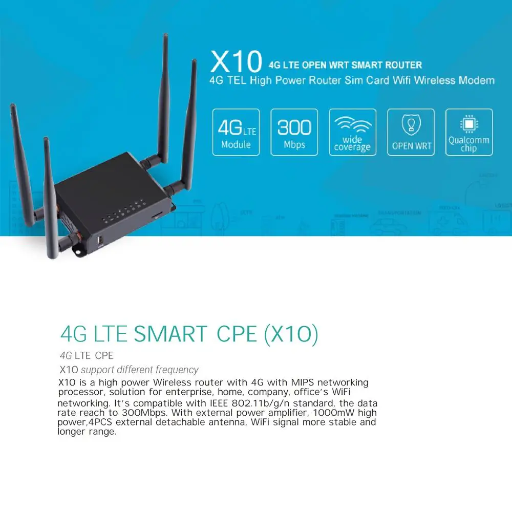 X10 4G LTE-это мощный беспроводной маршрутизатор с 4G с сетевым процессором MIPS, решение для предприятия, дома, компании, офиса, сети WiFi, совместим со стандартом IEEE802.11b/g/n, скорость передачи данных достигает 300 Мбит/с, с внешним усилителем мощности, 1000 МВт высокой мощности, 4 шт. внешняя съемная антенна, более стабильный WiFi сигнал и более длинный диапазон.