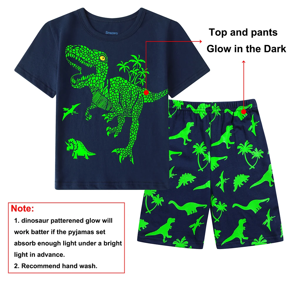 Пижама с динозавром светится в темноте. Свечение с рисунком динозавра будет работать лучше, если пижамный комплект поглотит достаточно светильник под яркий светильник заранее. Это очень популярный и привлекательный дизайн, отличный подарок для вашего сына/внука на день рождения или Рождество.